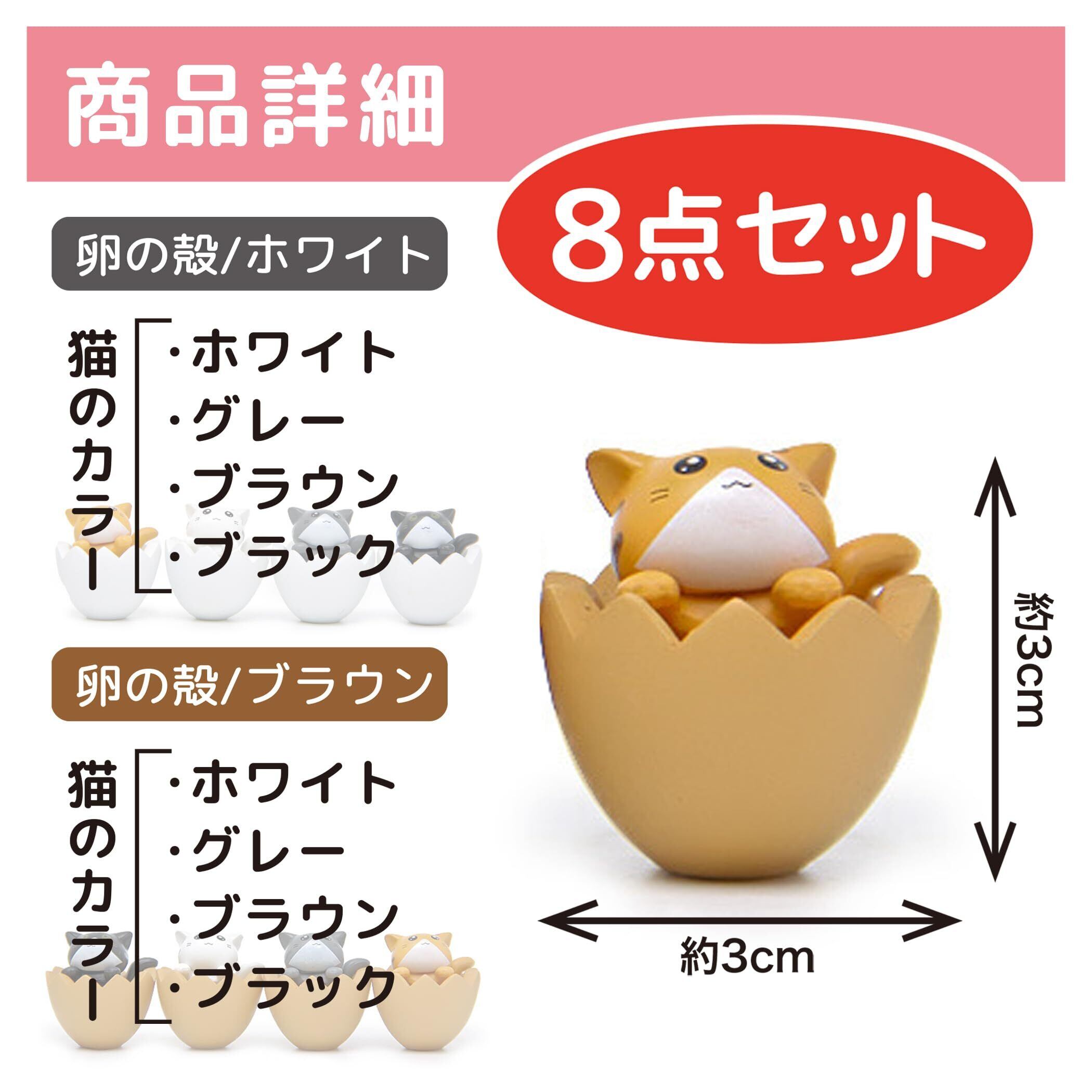 セット内容:A(卵の殻のカラー:ホワイト 猫のカラー:ホワイト)、B(卵の殻のカラー:ホワイト 猫のカラー:グレー)、C(卵の殻のカラー:ホワイト 猫のカラー:ブラウン)、D(卵の殻のカラー:ホワイト 猫のカラー:ブラック)、E(卵の殻のカラー:ブラウン 猫のカラー:ホワイト)、F(卵の殻のカラー:ブラウン 猫のカラー:グレー)、G(卵の殻のカラー:ブラウン 猫のカラー:ブラウン)、H(卵の殻のカラー:ブラウン 猫のカラー:ブラック) サイズ:約3×3cm ※モニターの環境等により、色の見え方に若干差が生じる場合がございます。
