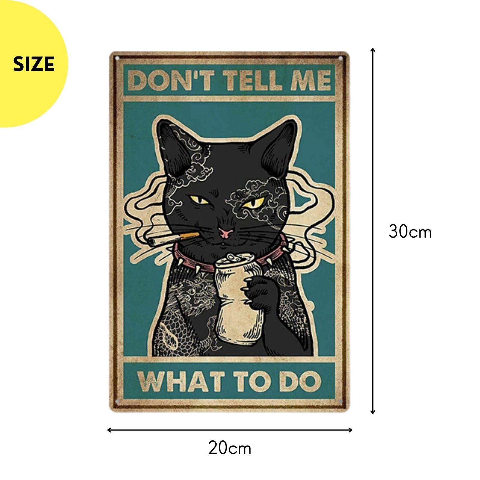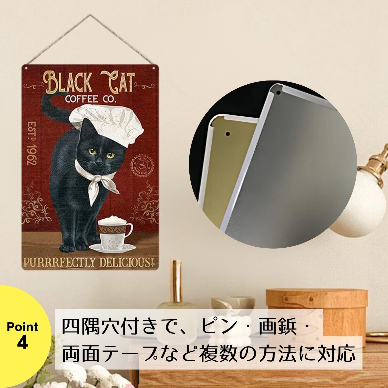 【サイズ・バリエーション】サイズ:約20×30cm。おしゃれな猫モチーフのブリキ看板です。豊富なデザイン展開(ダンス、読書、庭、料理、コーヒー、ユーモア系など)からお選びいただけます。四隅に穴があり、画鋲・ピン・ロープ・両面テープ等で簡単設置可能。