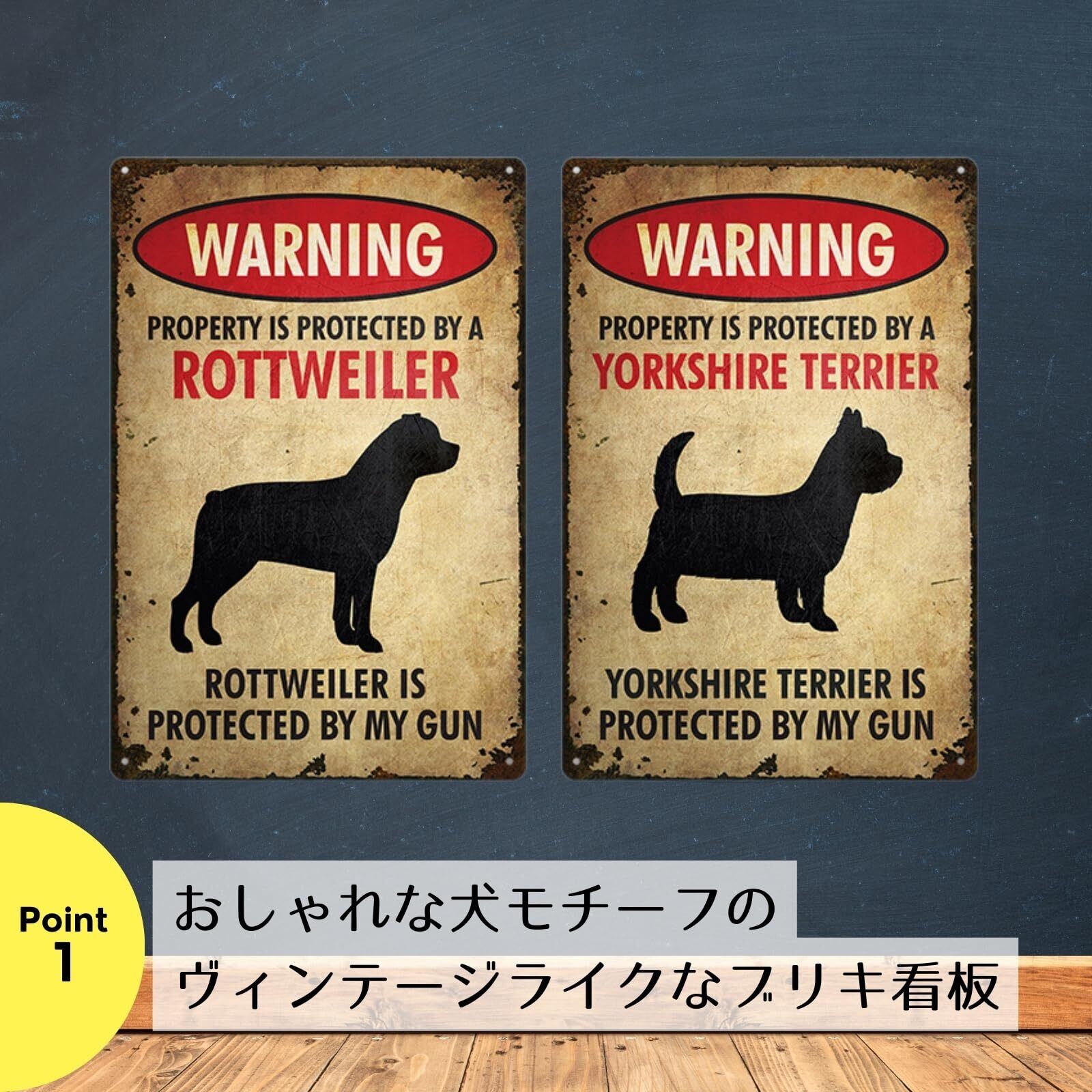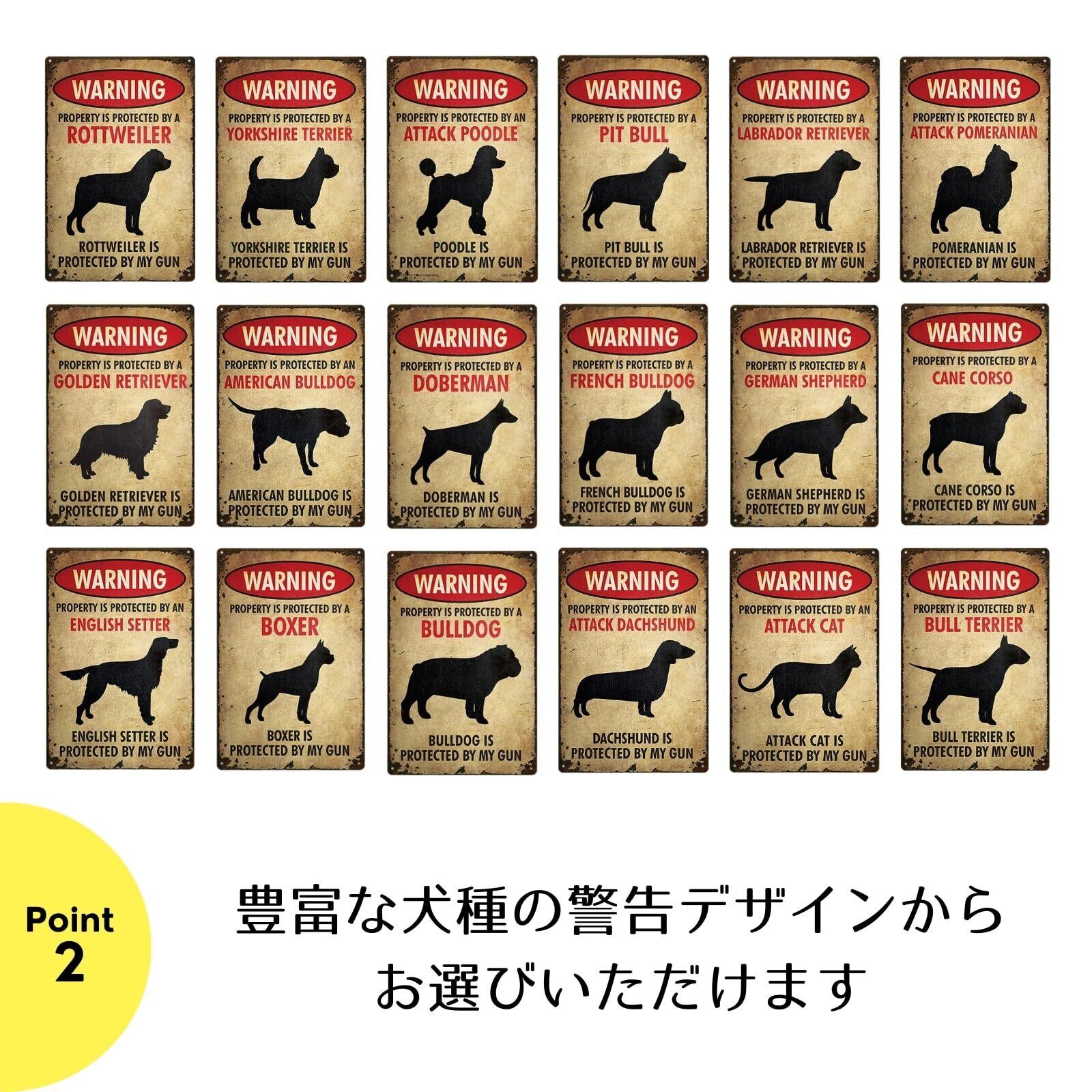 【サイズ・バリエーション】サイズ:約20×30cm。おしゃれな犬&猫モチーフのブリキ看板です。四隅に穴があり、画鋲・ピン・ロープ・両面テープ等で簡単設置可能。犬モチーフは豊富な犬種の警告デザインからお選びいただけます。