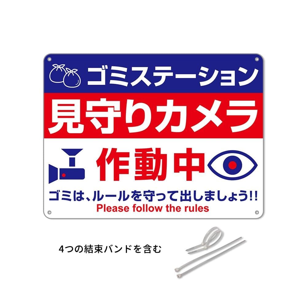ゴミステーション見守りカメラ作動中 防水アルミ製看板 。ゴミは、ルールを守って出しましよう!!ぶらさげる注意安全標識 4個結束バンド止め 取付簡単