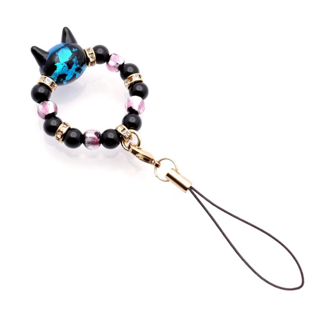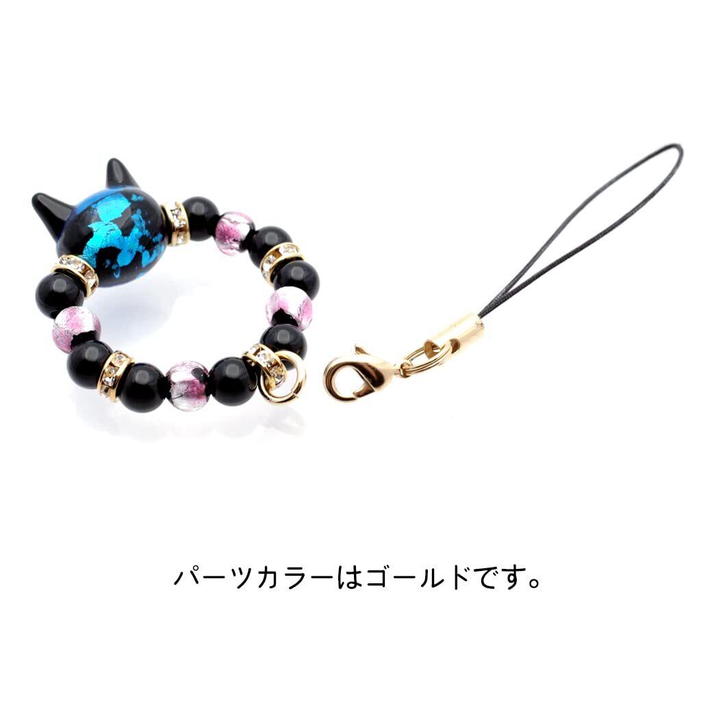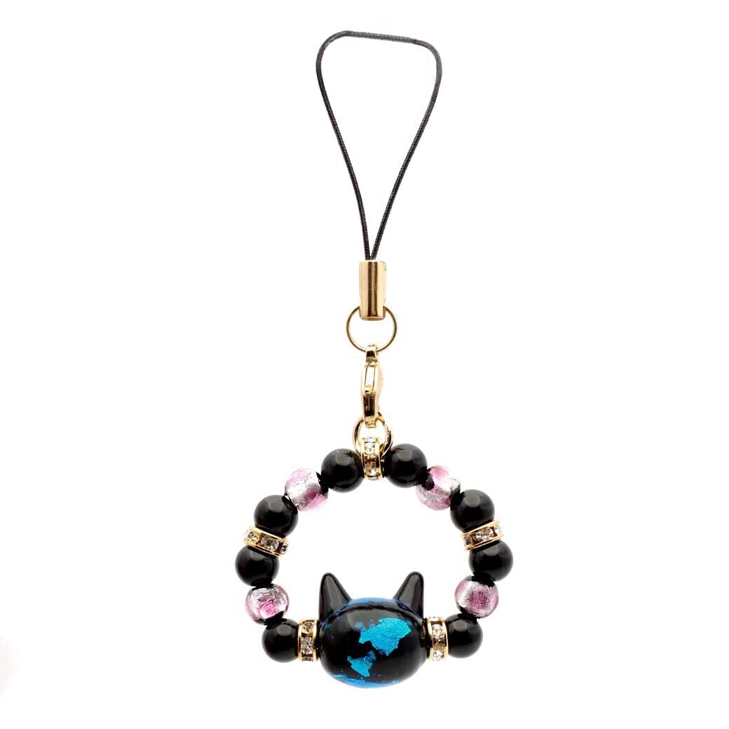 ネコ型のホタルガラスビーズを使用したストラップです。