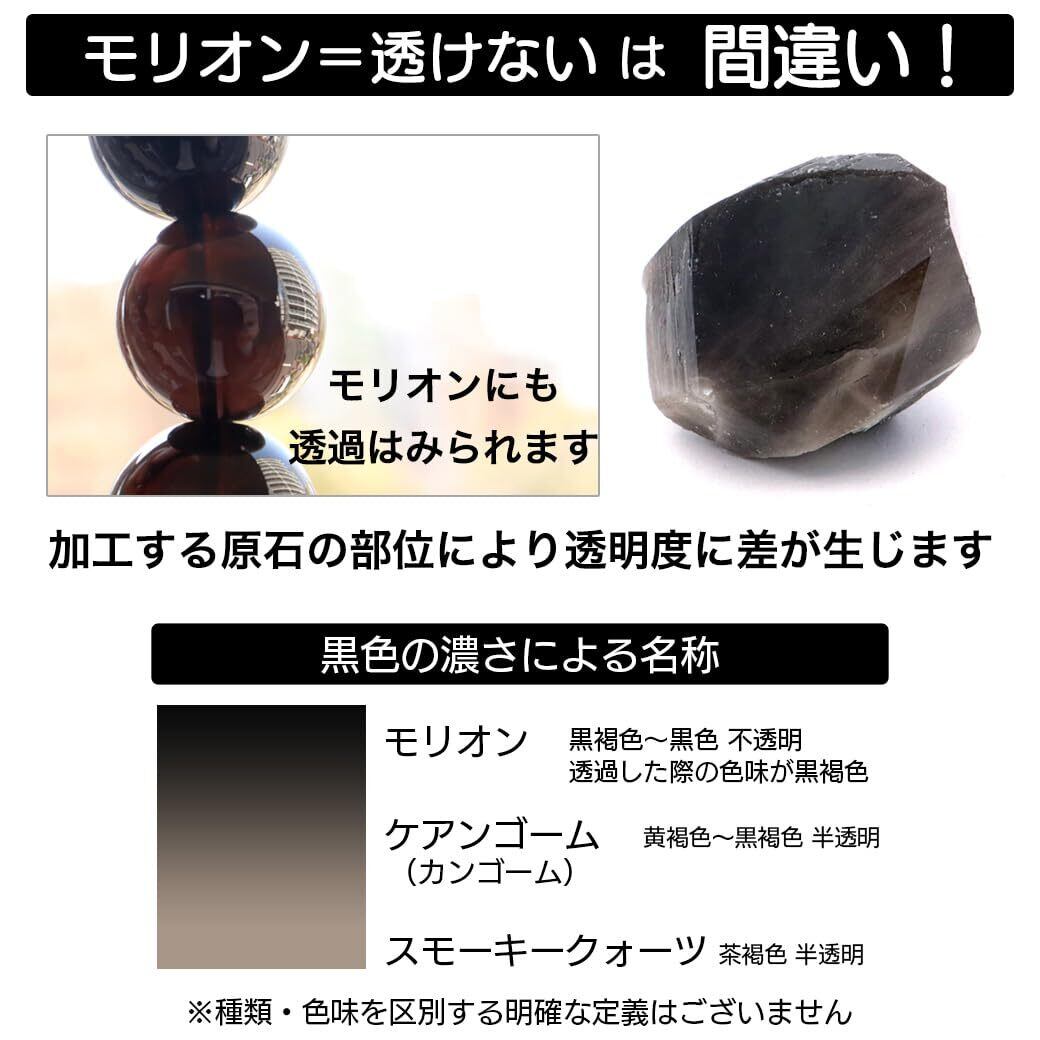 モリオンは黒水晶であるため、鉱石の性質上、強い光を当てると透過します。モリオンは色味が黒色で不透明、透過した際の色味が黒褐色のものをモリオンと言います。ケアンゴームやスモーキークォーツは透明感があり、色味が茶褐色のものを指します。