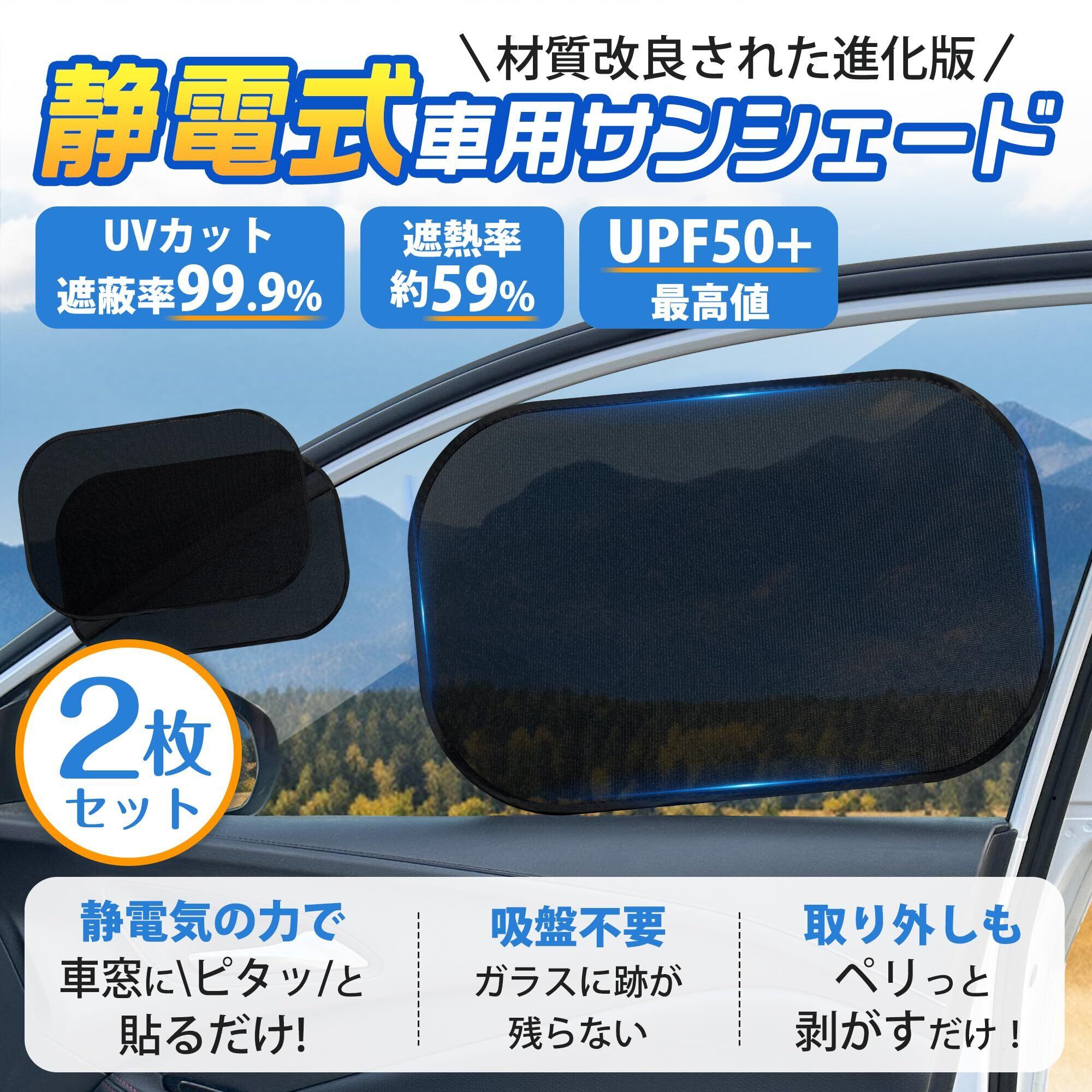 【 PVC静電膜+超高密度マイクロメッシュ 】 材質改良の進化版!静電式車用サンシェードは、視界を確保しつつ、太陽のまぶしさや日焼けをしっかりカット!軽量で薄手のシェードが、静電気の力でピタッと窓に吸着。吸盤なしで窓に跡が残らないのもポイントです。PVC静電膜面:遮光・遮熱効果で、99%以上の紫外線を強力カット。後部座席に乗る紫外線に弱いお子様をしっかり保護します。超高密度マイクロメッシュ面は、外からの視線を遮りつつ、車内からは外の風景の視界も確保できます。