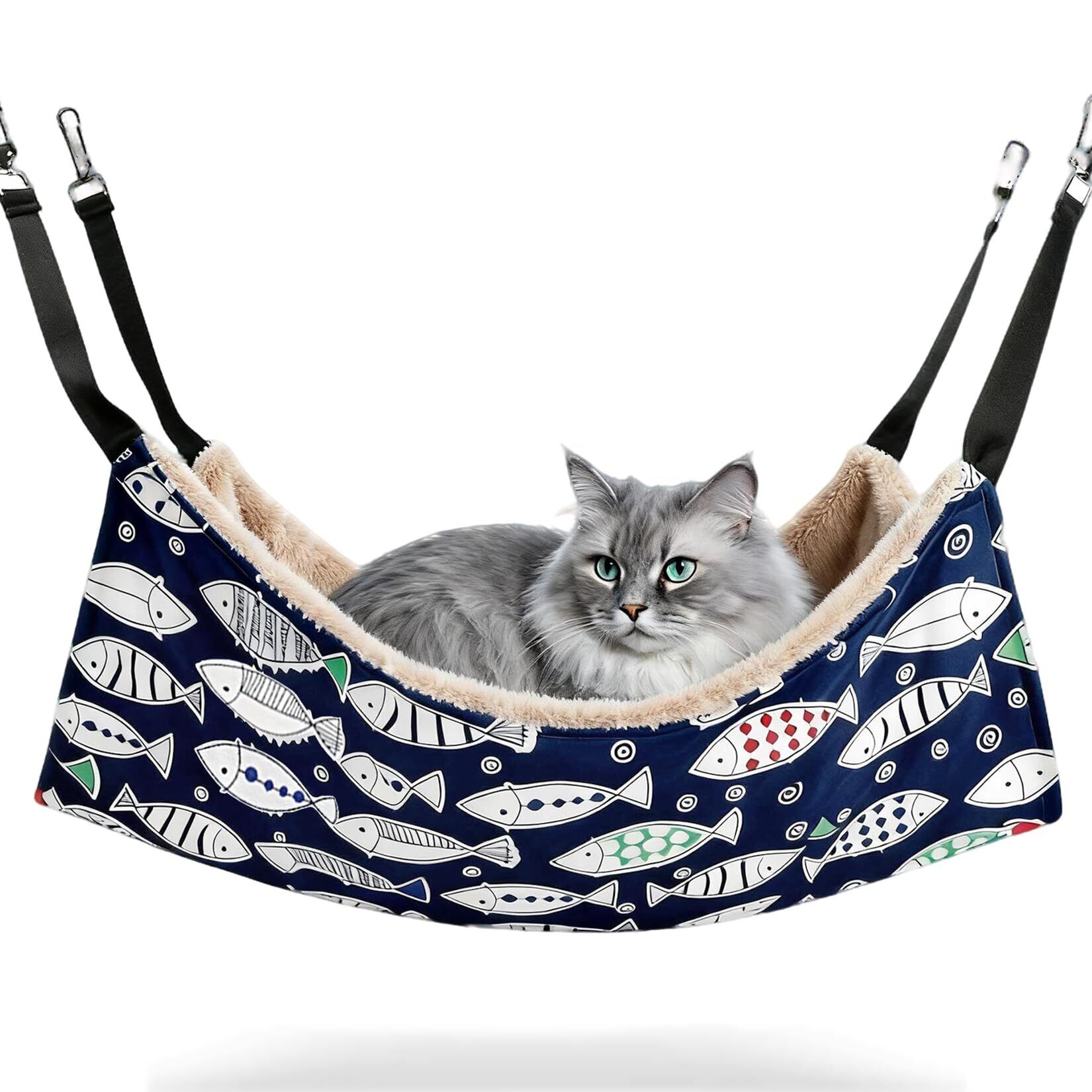 【2022最新】猫 ハンモック キャットハンモック 吊り下げベッド ケージ用 秋冬款 加绒 56x48cm ヒモ調整可能 耐荷重 10KG 子猫成猫適用 ペットベッド ねこハンモック 金具丈夫 洗濯可能 暖かく快適 日向ぼっこ 昼寝用 調節可能 両面使用 (魚柄)