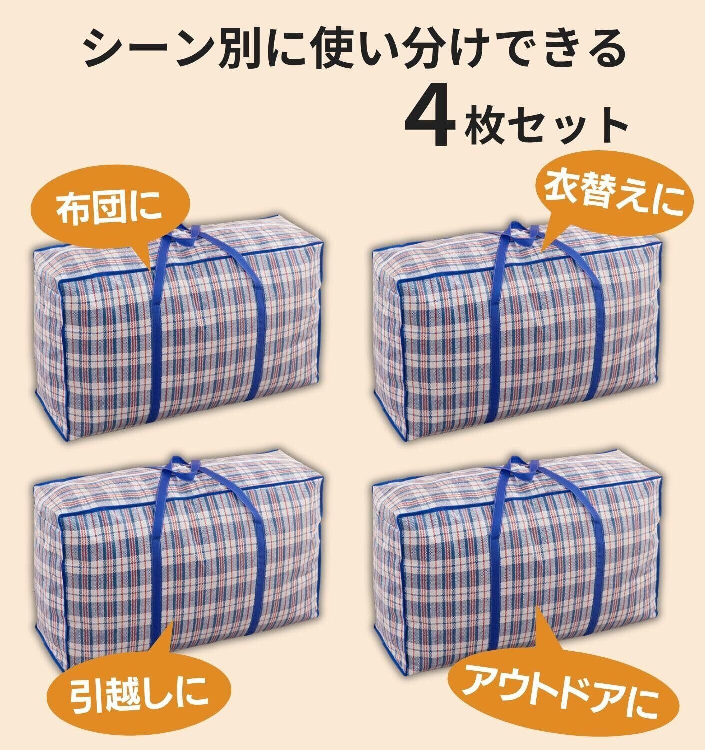 【シーンで使い分け】カラーはブラック・レッド・ブルーの3色展開。1セットに4枚入りで、衣替え・引っ越し・布団収納・アウトドアなどシーンに応じて使い分け可能。家庭や車、倉庫など多用途で活躍します。