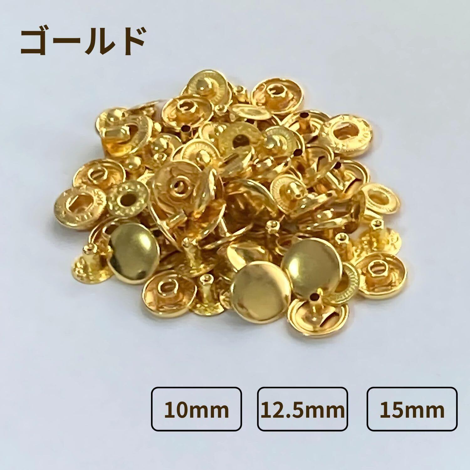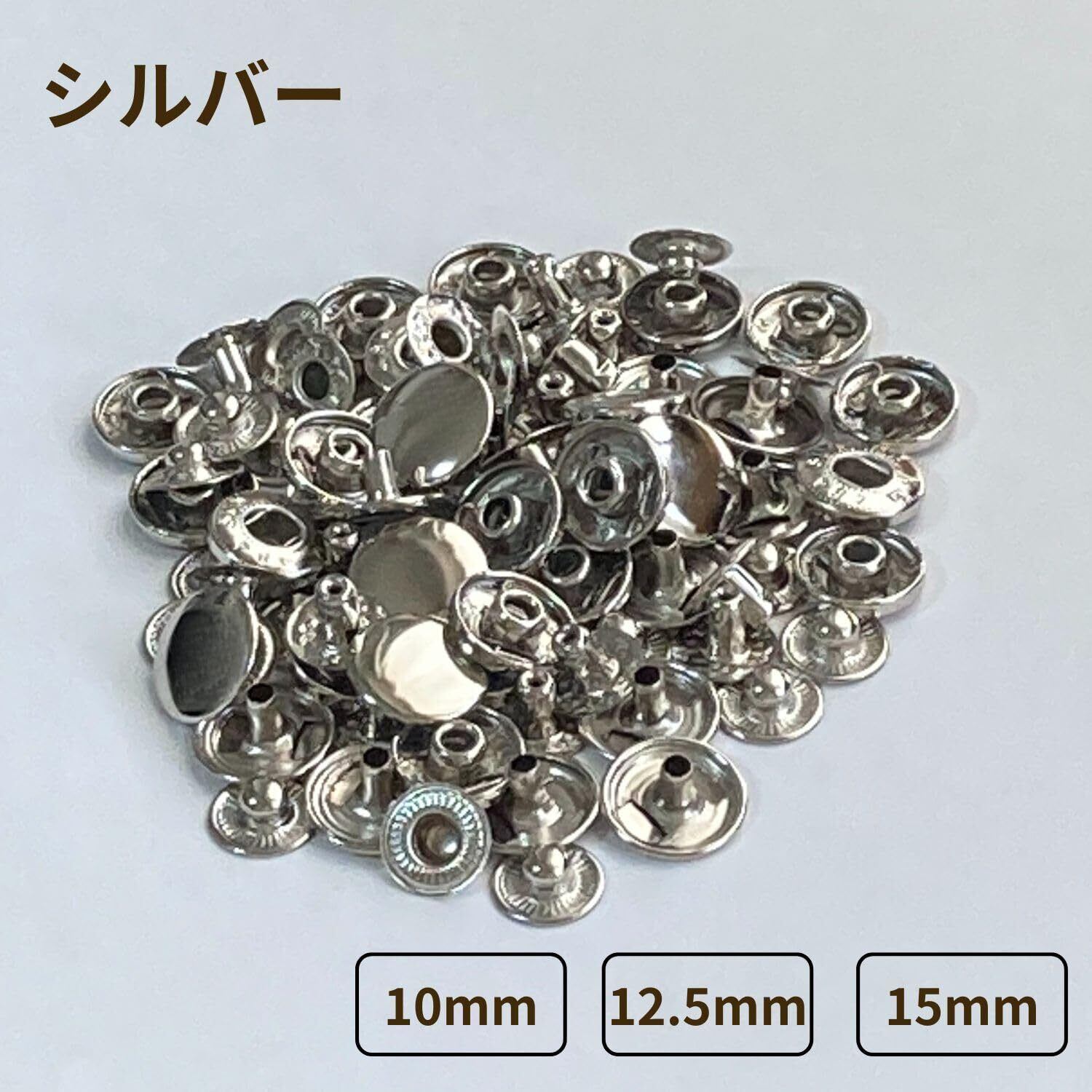 レザークラフト・ハンドメイド・補修に。スナップタイプの金属ボタンを着けるためのセットです。 カラーはゴールド・シルバー・アンティークゴールド(ブロンズ) サイズはヘッドサイズ直径10mm 12.5mm 15mm よりお選びいただけます。