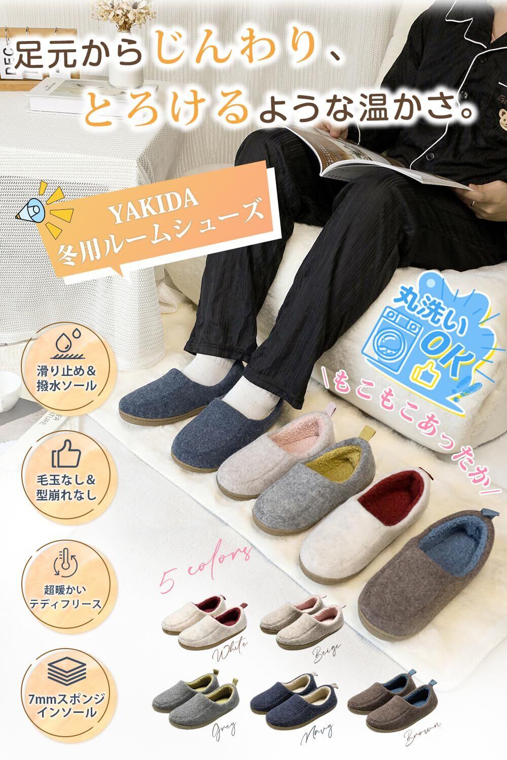 [YAKIDA] ルームシューズ 冬 モコモコ スリッパ 室内 レディース 【超温かい・しわや毛玉出ない】 暖かい 室内履き かかとあり メンズ 洗える 静か 滑り止め