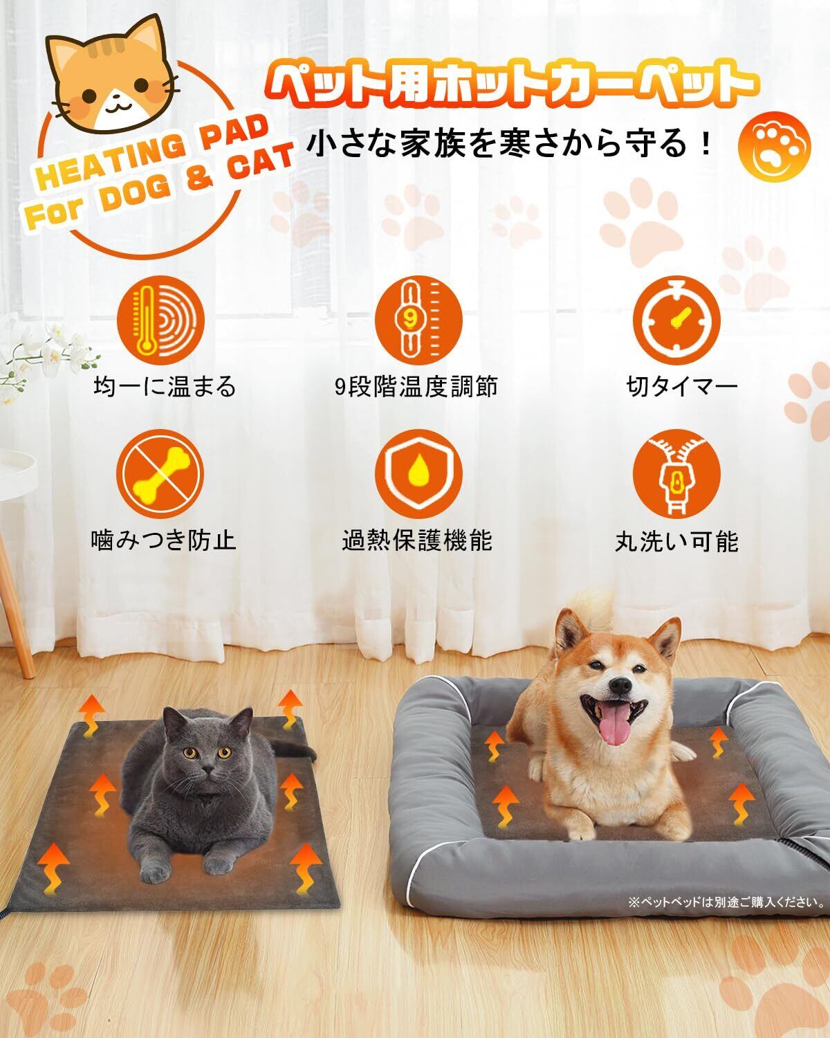 【切タイマー&過熱防止機能】切タイマー機能がついているので、タイマーボタンで2時間・4時間・8時間・12時間など切る時間を設定し、つけっぱなしで出かけられます。低温やけどの心配もないので安心です。また、ペット用ホットマットはサーモスタット機能搭載で、温まりすぎを感知すると自動で運転を停止します。