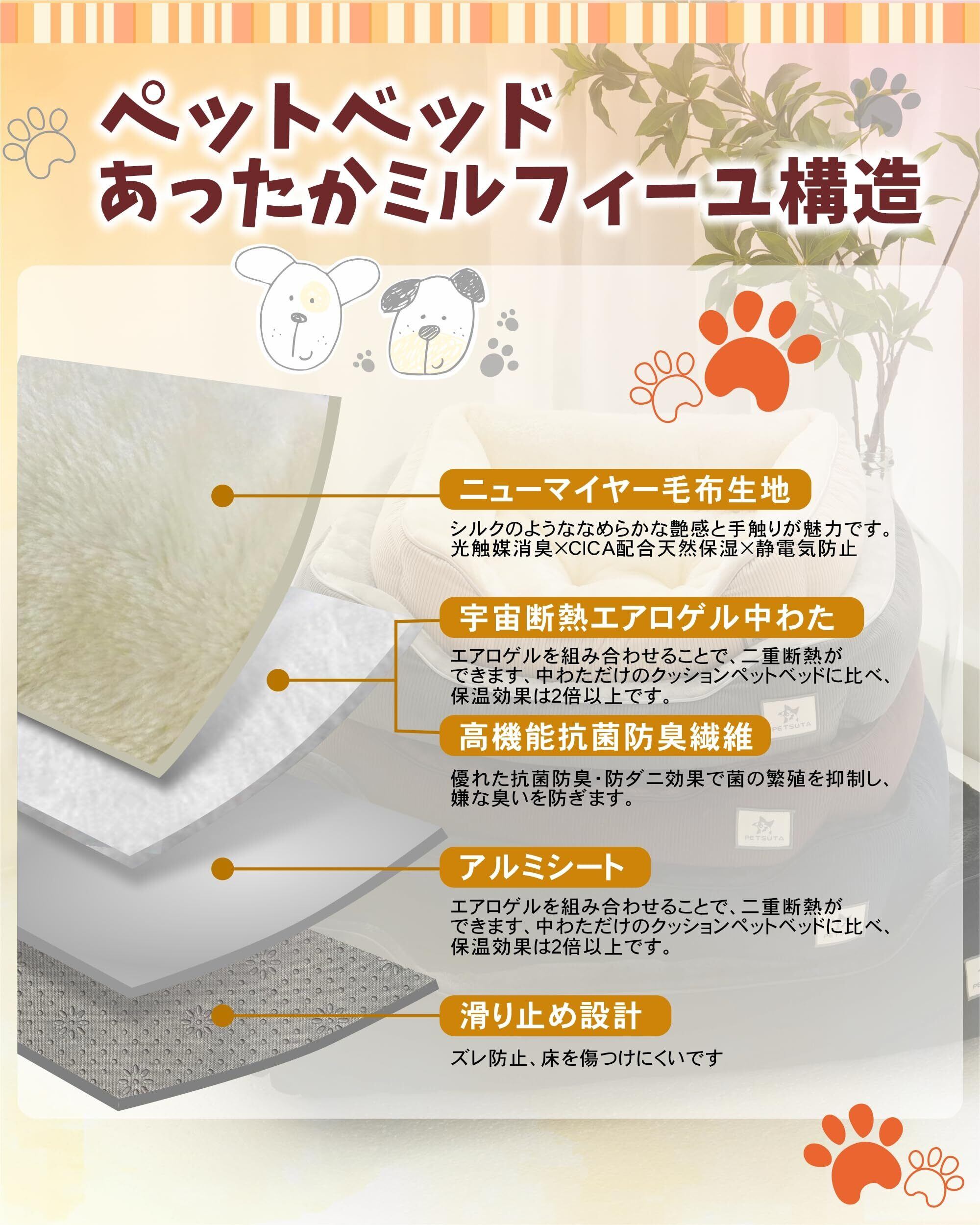 【断熱革命・爆速の暖かさ】猫 犬 ベッドの内側には日本伝統的な毛布織り方「ニューマイヤー」生地を使用しており、自然由来のコーヒーファイバー素材を採用されています。さらにベッドの詰め物には革新的な発熱繊維わたと革命的な断熱素材アエロゲル繊維+アルミシートのW断熱構造で爆速の暖かさを実現した、極寒時期には至福のあったかペットベッドです。