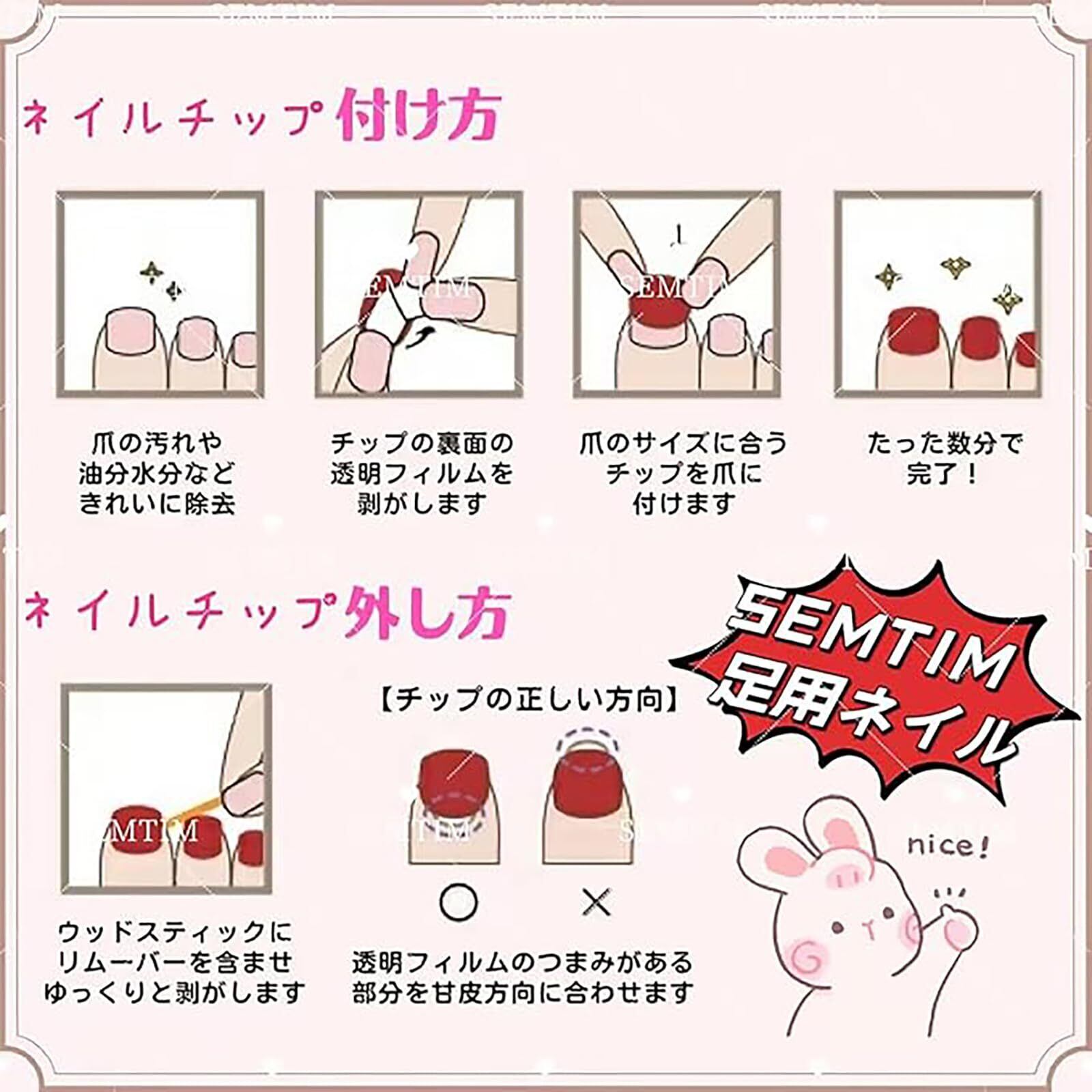 4.ご使用上の注意事項:油分や水分を拭き取らずに着けた場合、チップが剥がれやすくなります。隙間などがある場合、水などが入りやすく爪が変色する場合がございますのでご注意ください。