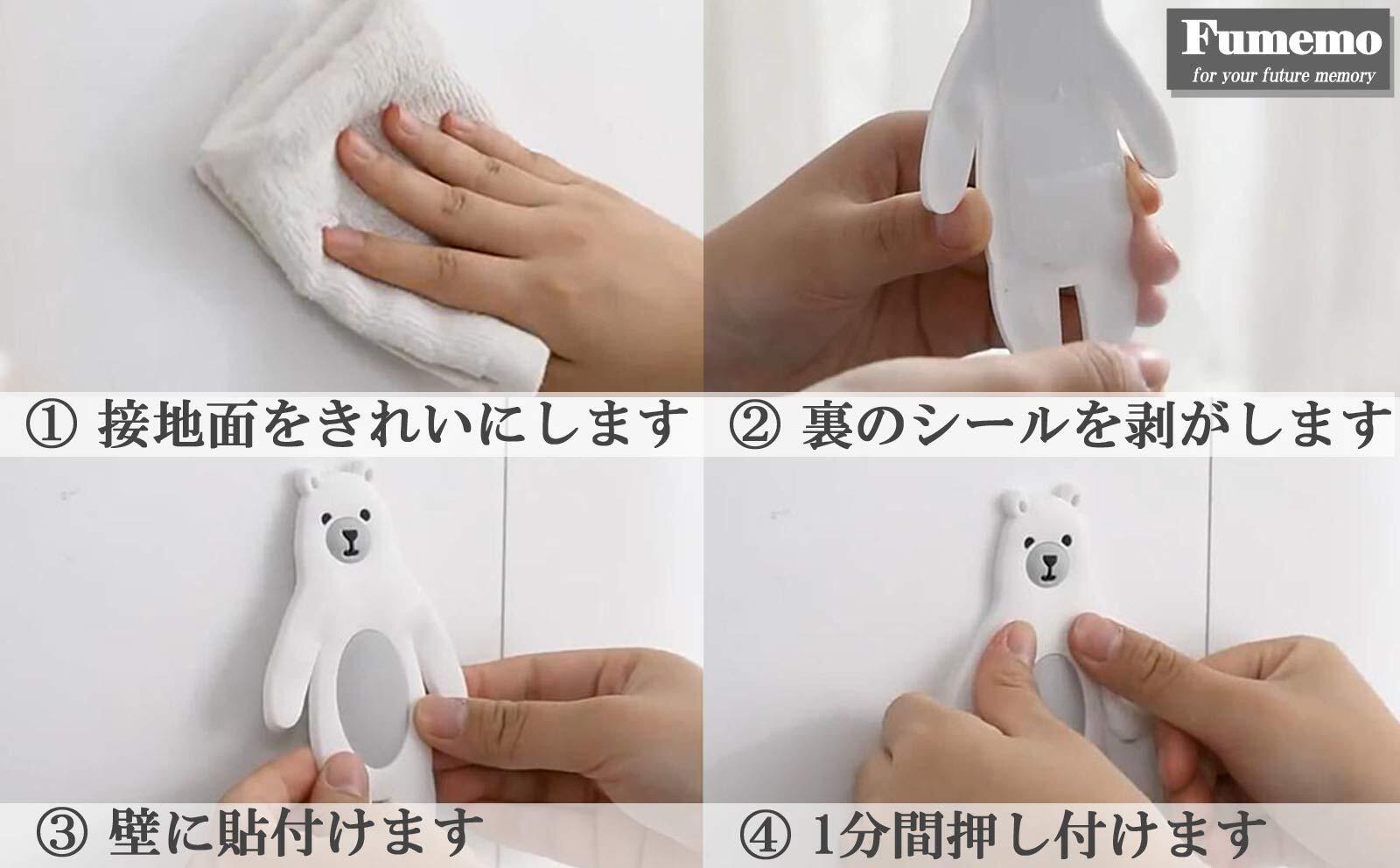 壁を きれい に拭き、 アニマルフック の接着面を乾いた状態で貼り付けます。はりつけ後1分間押し続け取り付けます。