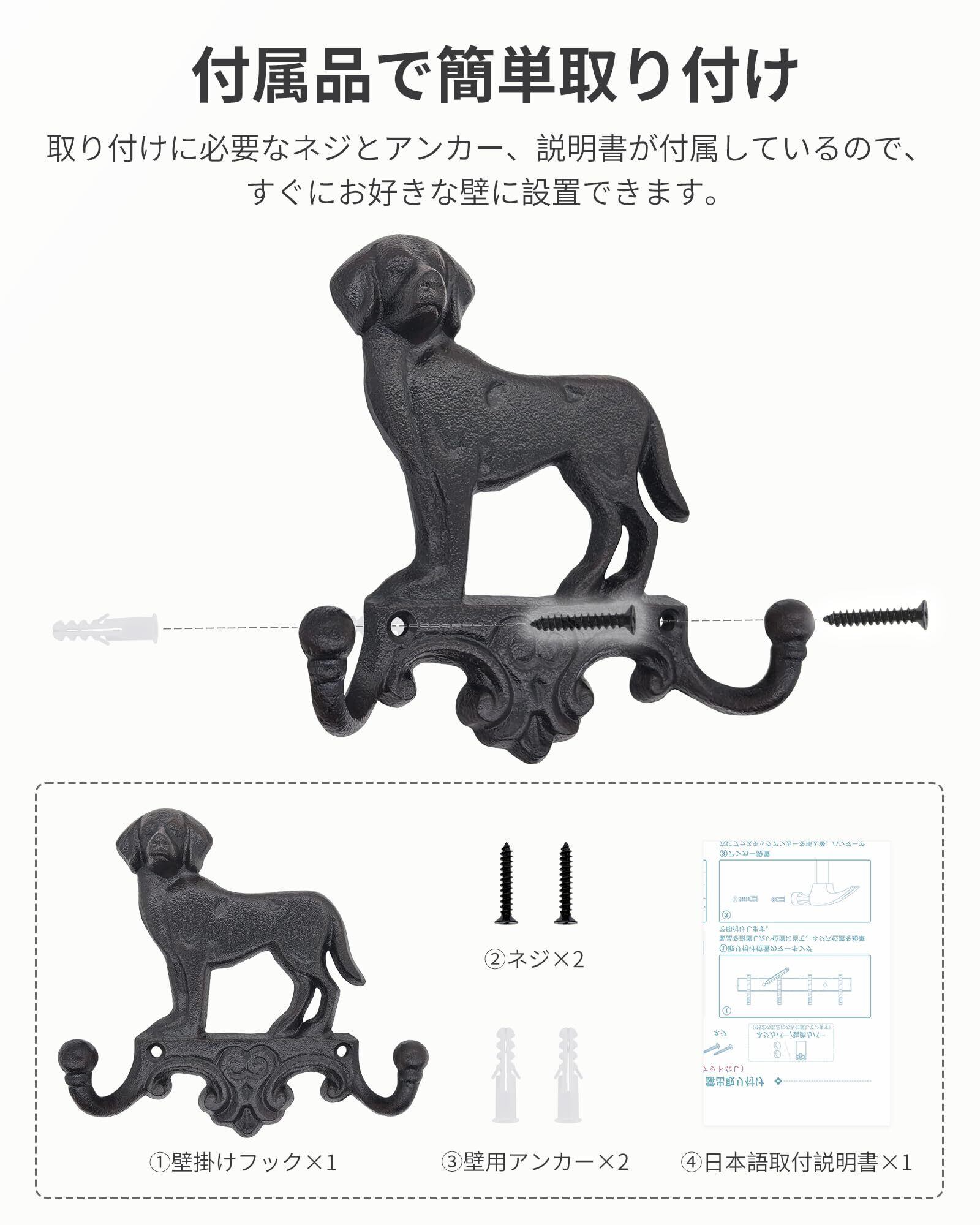 壁掛けフック 犬 鋳鉄製 アンティーク調 ウォールフック おしゃれ かわいい 動物 ダブル フック 玄関 庭 ベランダ 壁 収納 装飾 鍵 バッグ コート タオル 服 帽子 ウォールハンガー ブラック 1個入