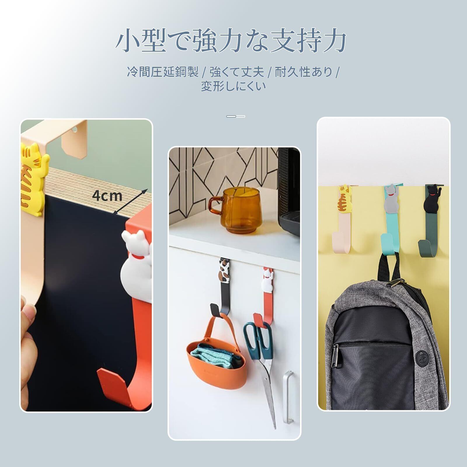 【猫モチーフの可愛いデザイン】:猫 フック の可愛いモチーフで、子供部屋や玄関に遊び心をプラス ドア裏に掛ける 扉にかける収納フック として 省スペース でおしゃれな収納が可能 工具不要で 賃貸OK な簡単取り付けが嬉しいポイントです