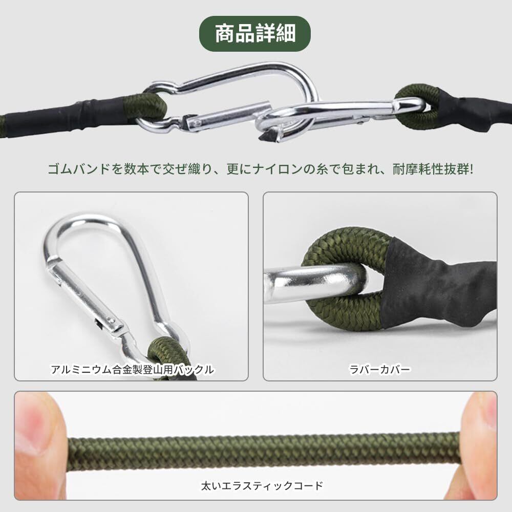 【脱落防止デザイン】物品が使用中に落下しないようにするため、ゴムロープが、登山用のフックのデザインを採用しています。ロープとカラビナの接続部は強化されておりますので、良好な耐荷重性能を確保します。耐久性にも優れており、長期間にわたって信頼のおけるパフォーマンスを提供します.