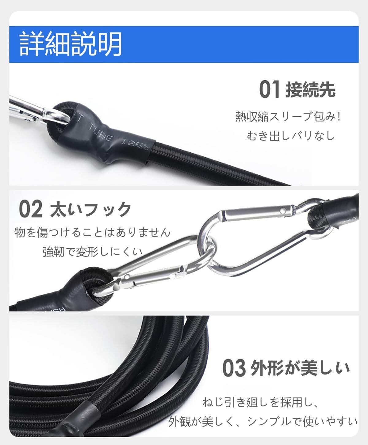 【2本セットの大容量】ゴムロープが2本セットで提供され、各々1メートルの長さと直径8mmを備えています。最大1.5メートルまで伸ばすことが可能です。