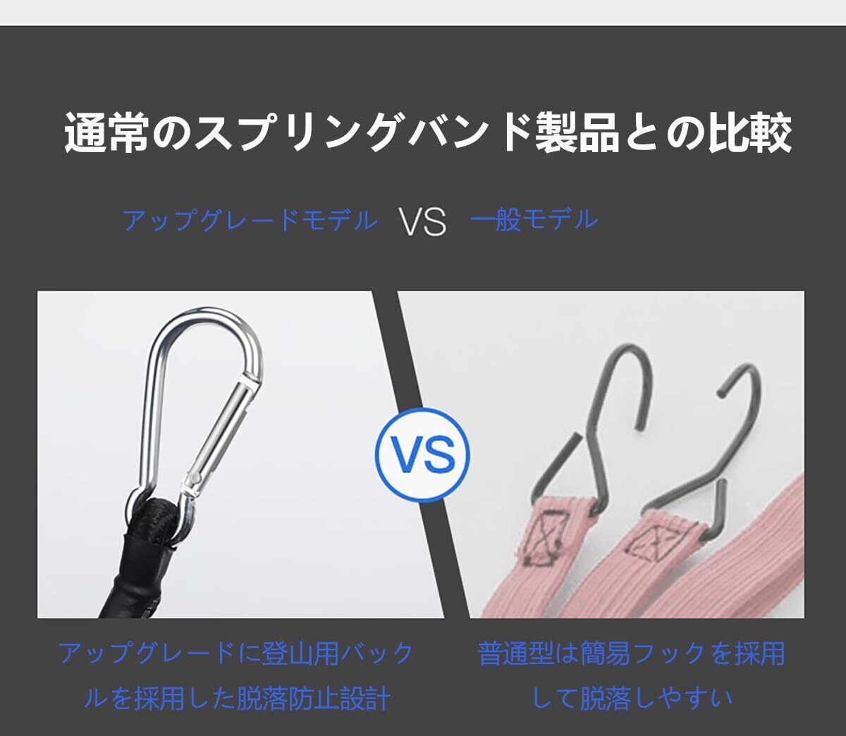 【脱落防止機能】使用中の物品の落下を防ぐため、ゴムロープには登山用フックのデザインが採用されています。