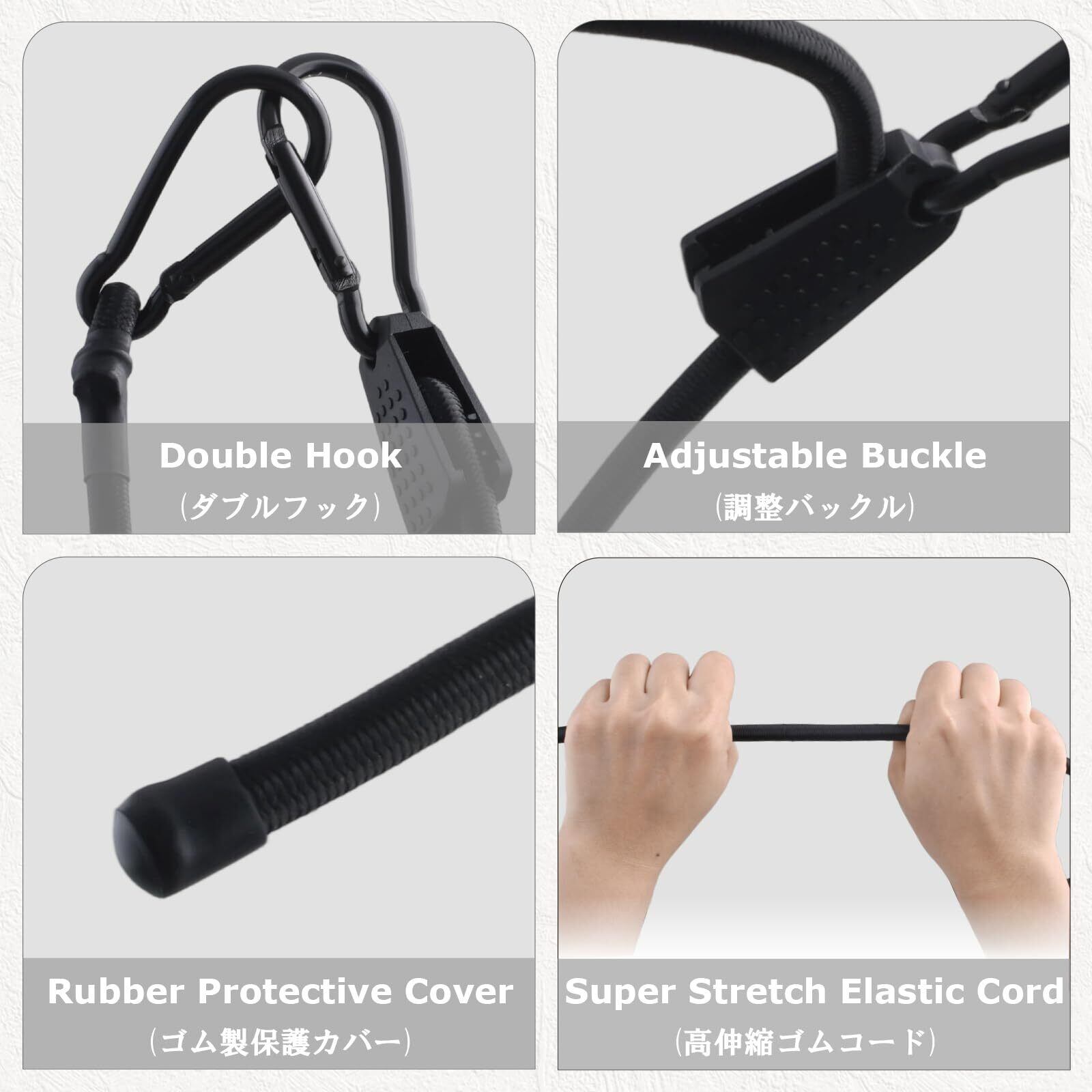 YAPJEB ゴムバンド 調節式 カラビナフック 1m 2m バンジーコード ゴムひも 固定ベルト 荷締め ゴムロープ 荷台用 落下防止 自転車 バイク キャンプ アウトドア (01 ブラック- 4 本, 1m)