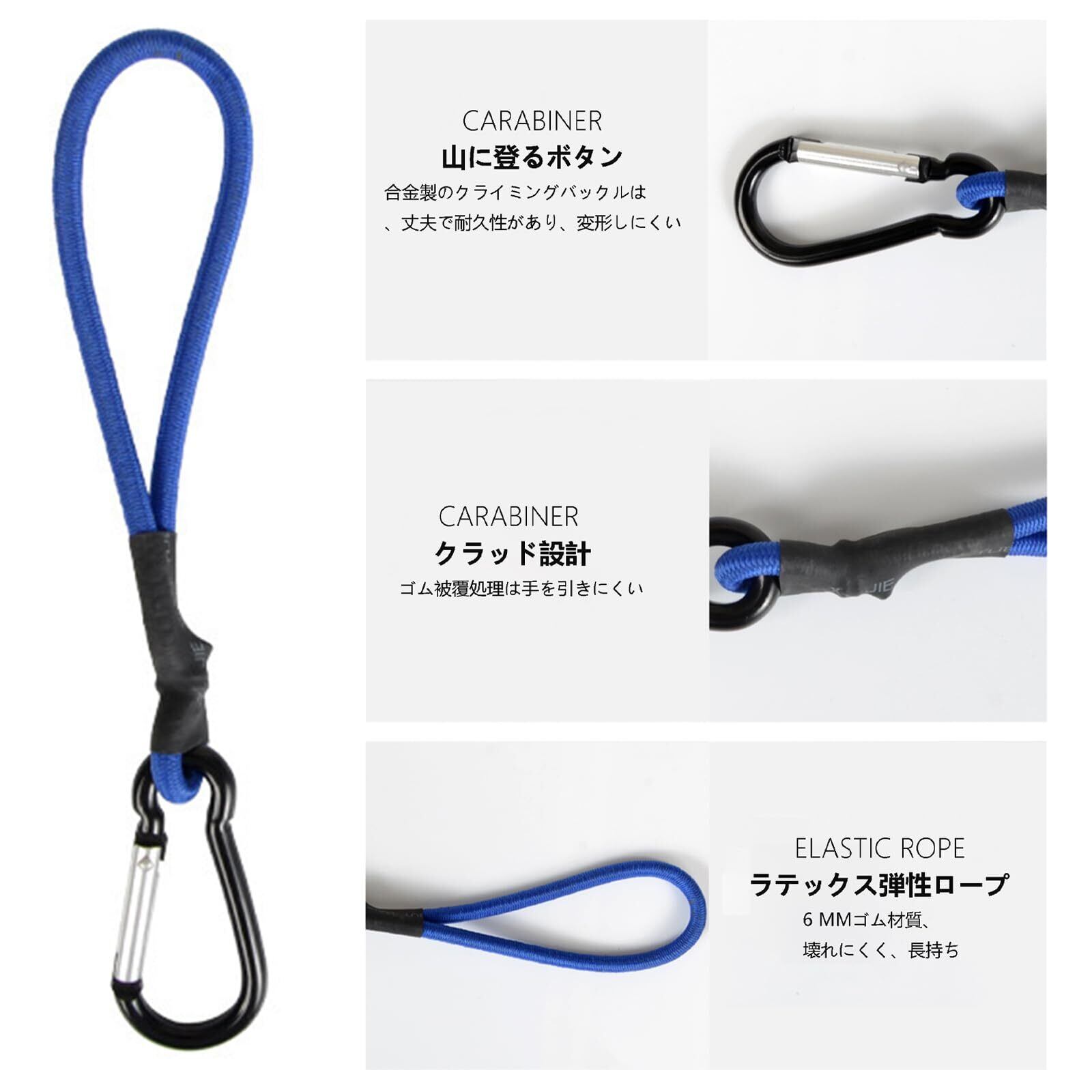 [材質]ゴムフックは6mmのラテックスゴムコードで作られており、柔軟で耐摩耗性に優れ、壊れにくいです。合金のバックル、耐久性があり、変形しにくいです。