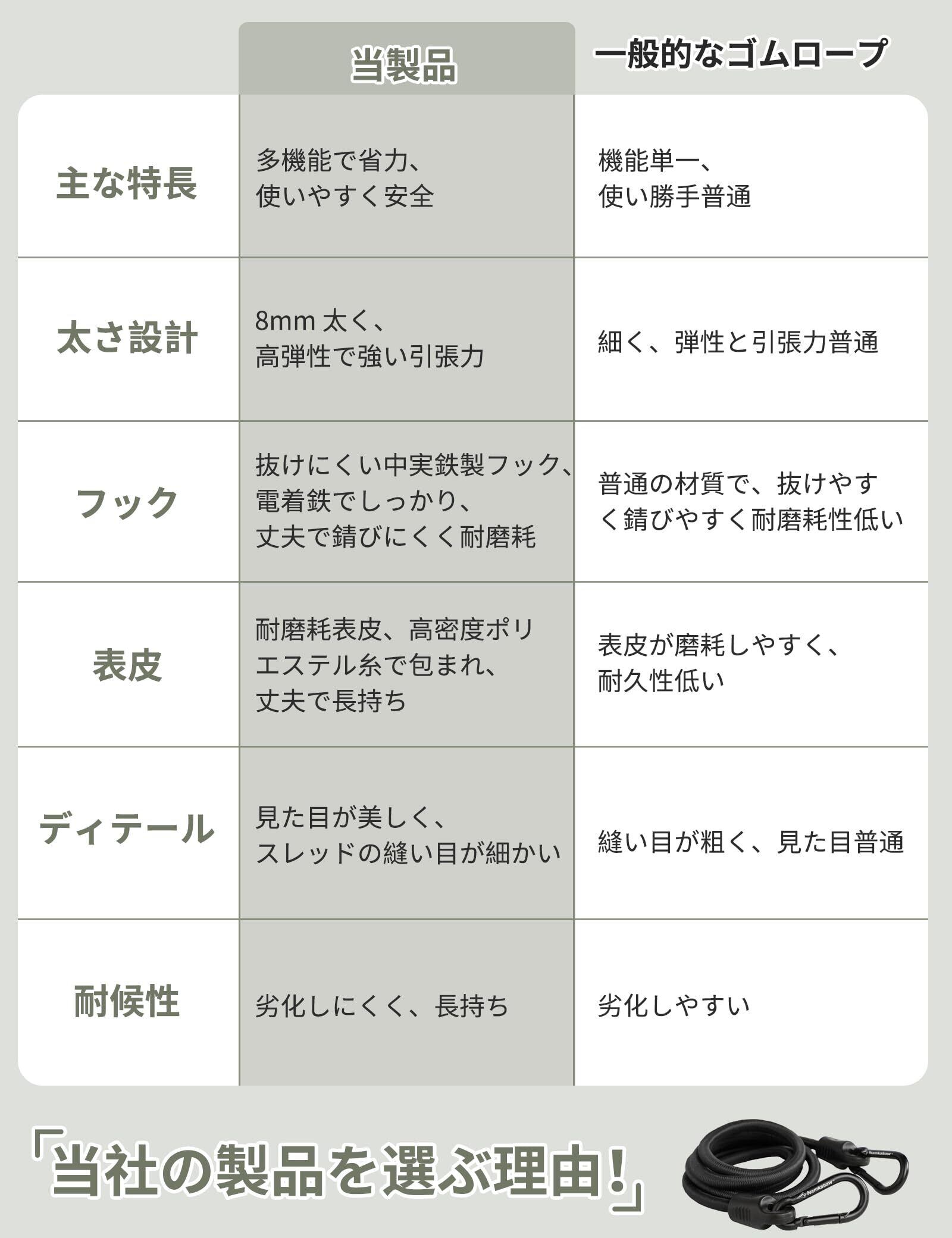 【金属咬合+熱収縮チューブ】傷つけない強固固定ロープとフックの接続部は 金属咬合でしっかり結合!さらに 熱収縮チューブで被覆,金属が直接触れないので、テントやバッグの繊維を傷つけない。アルミ合金フックは錆びに強く,雨天でも安心使用可能。