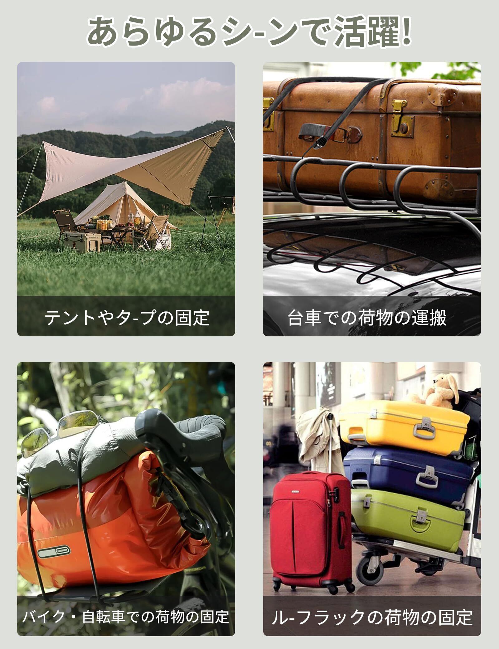 【アウトドア × 生活】万能固定具が場面を選ばないキャンプ(テント固定・ランタン吊り)だけでなく、車のトランク荷物梱包・自宅雑貨収納(スポーツ道具・ケーブル掛け)・ピクニックシェード固定 まで! 2 種の長さで使い分け、アウトドアから日常まで超便利