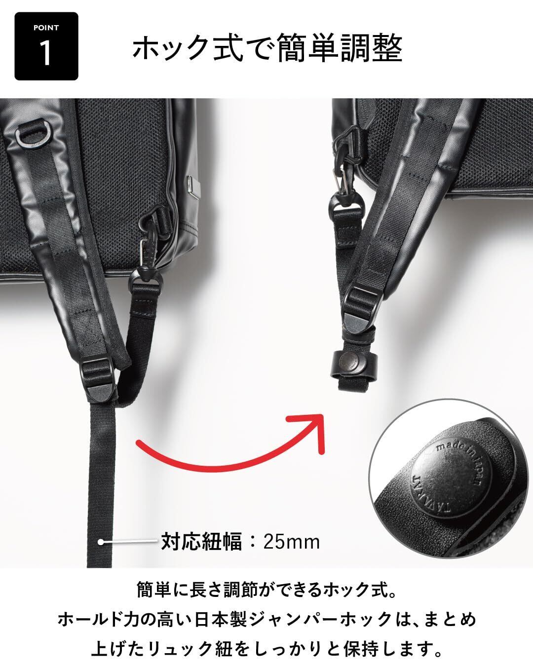 簡単に長さが調整できるホック式。ホールド力の高い日本製ジャンパーホックは、まとめ上げたリュック紐をしっかりと保持します。