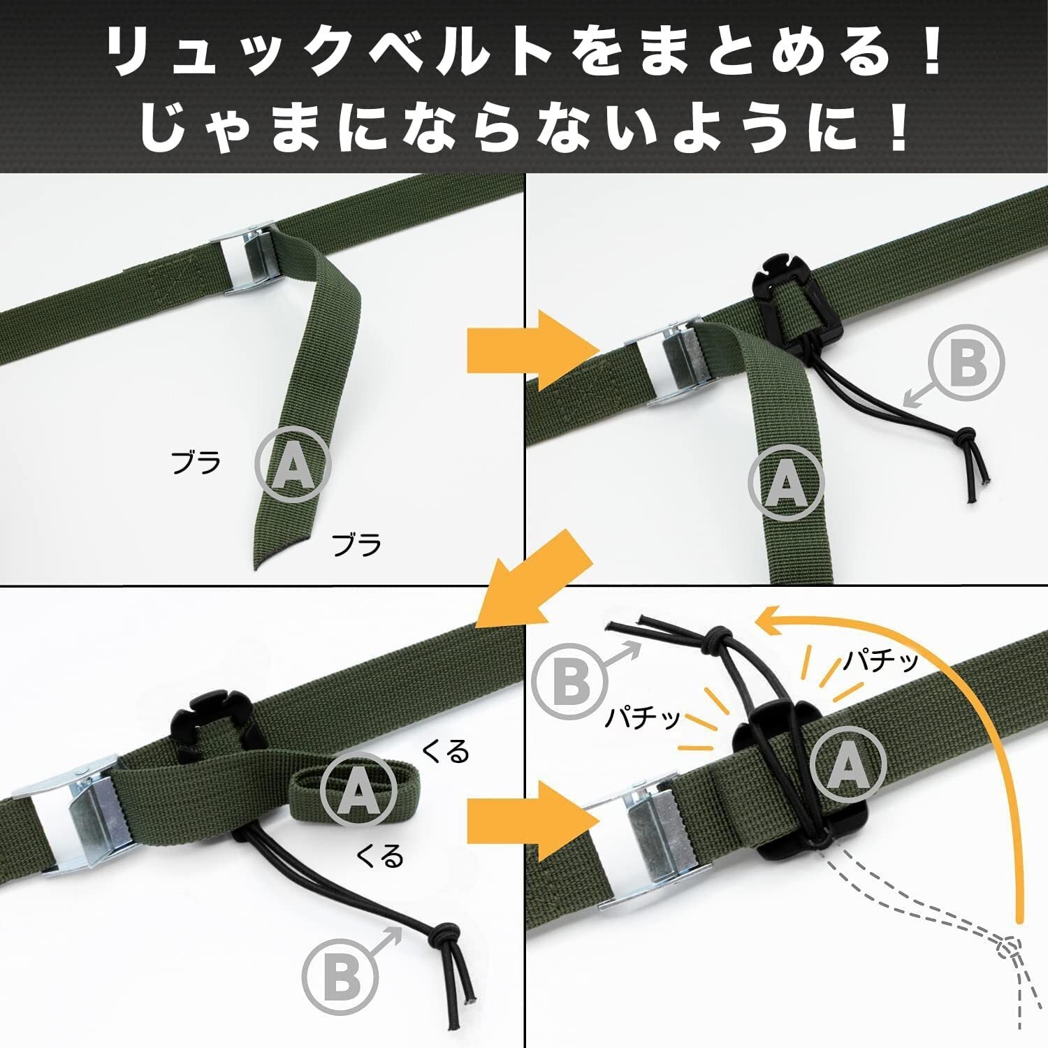 「高強度硬質プラスチック」強度と軽さ両立する硬質プラスチックとナイロン伸縮紐を使用して非常に長く使えます。サイズもコンパクトで多くのリュックベルトに適用し使いやすいです。