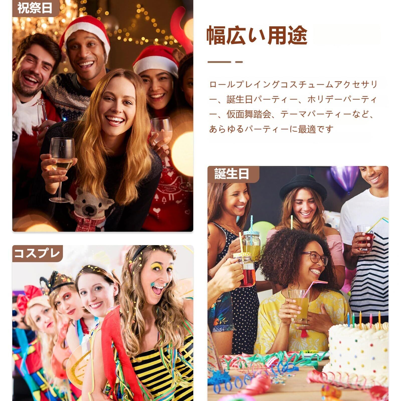 簡単装着で様々なヘアスタイルに対応:伸縮性のあるヘッドバンド部分は幅広い頭囲にフィットし、様々なヘアスタイルに合わせやすく使いやすい設計です。手軽にコスプレの雰囲気をアップさせます。