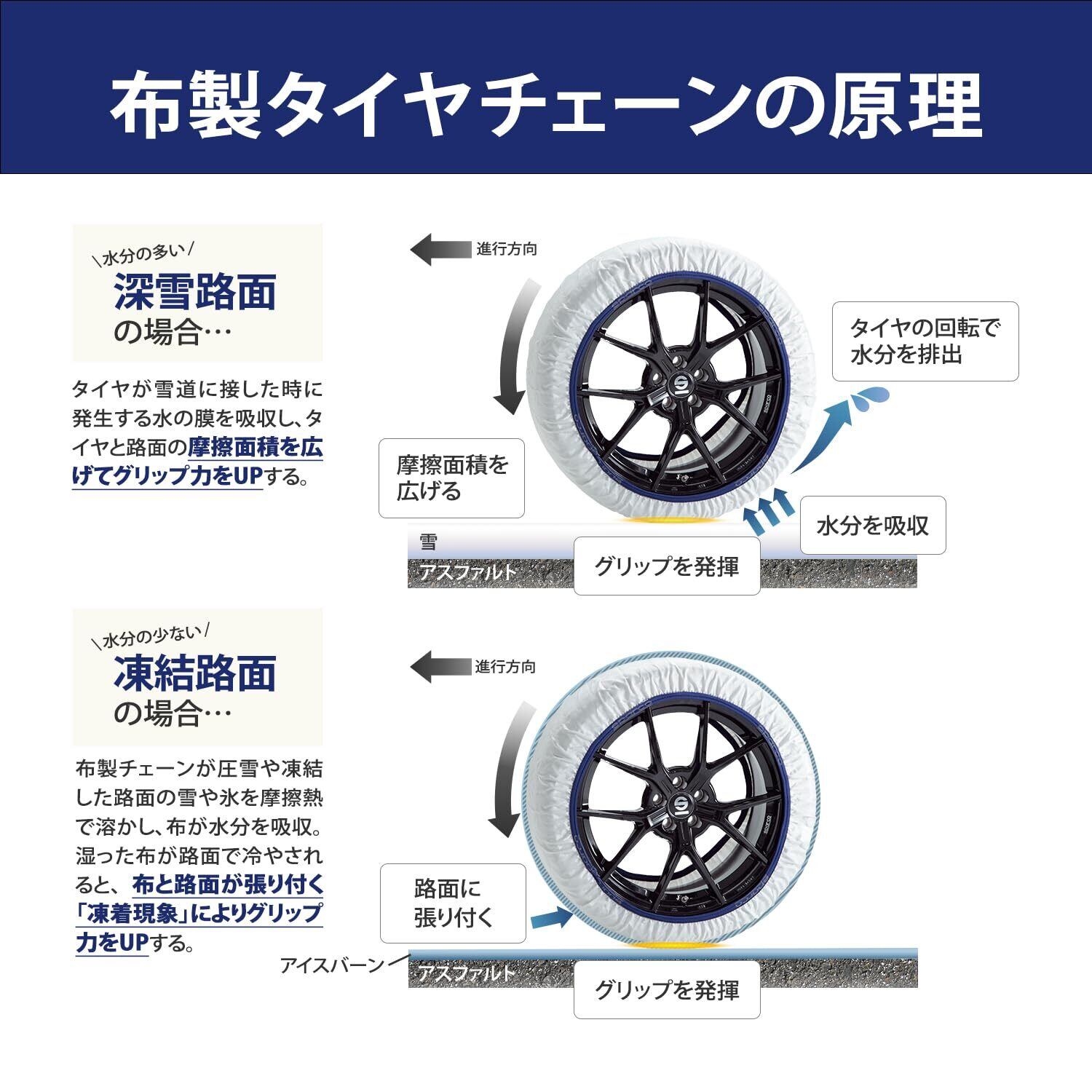 ■静音:静音性は本品最大の特徴。非常に静かで乗り心地を損わず、布製なのでタイヤ、アルミホイールにもダメージを与えません。金属チェーンの場合は走行時、ホイールに傷などを与える場合があります。