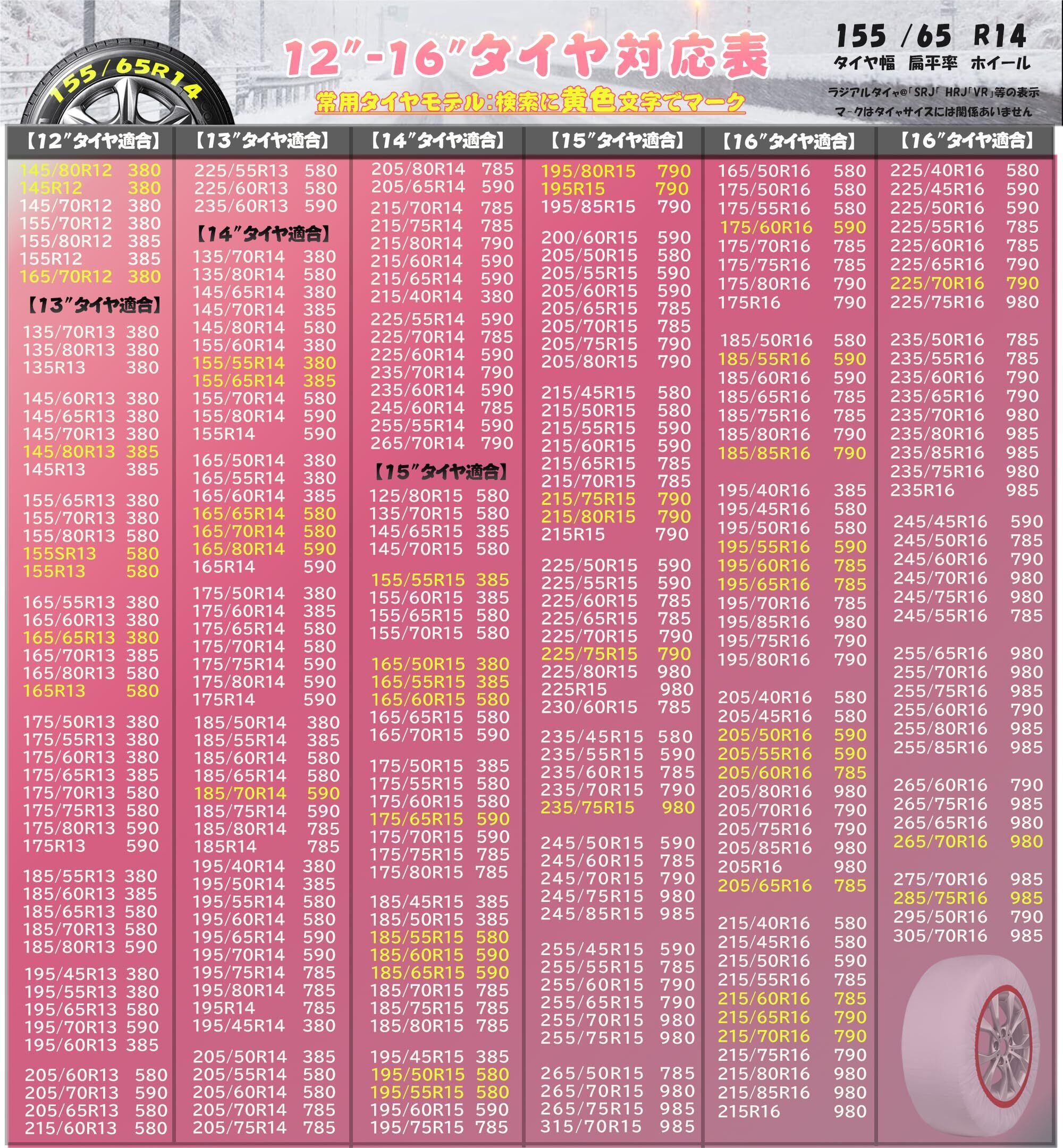 素早く簡単に装着:布製タイヤチェーン の装着は簡単で便利です。特別な工具を必要とせず、素早く安全にタイヤに取り付けることができる。また、軽量でコンパクトなので、トランクに簡単に収納できます