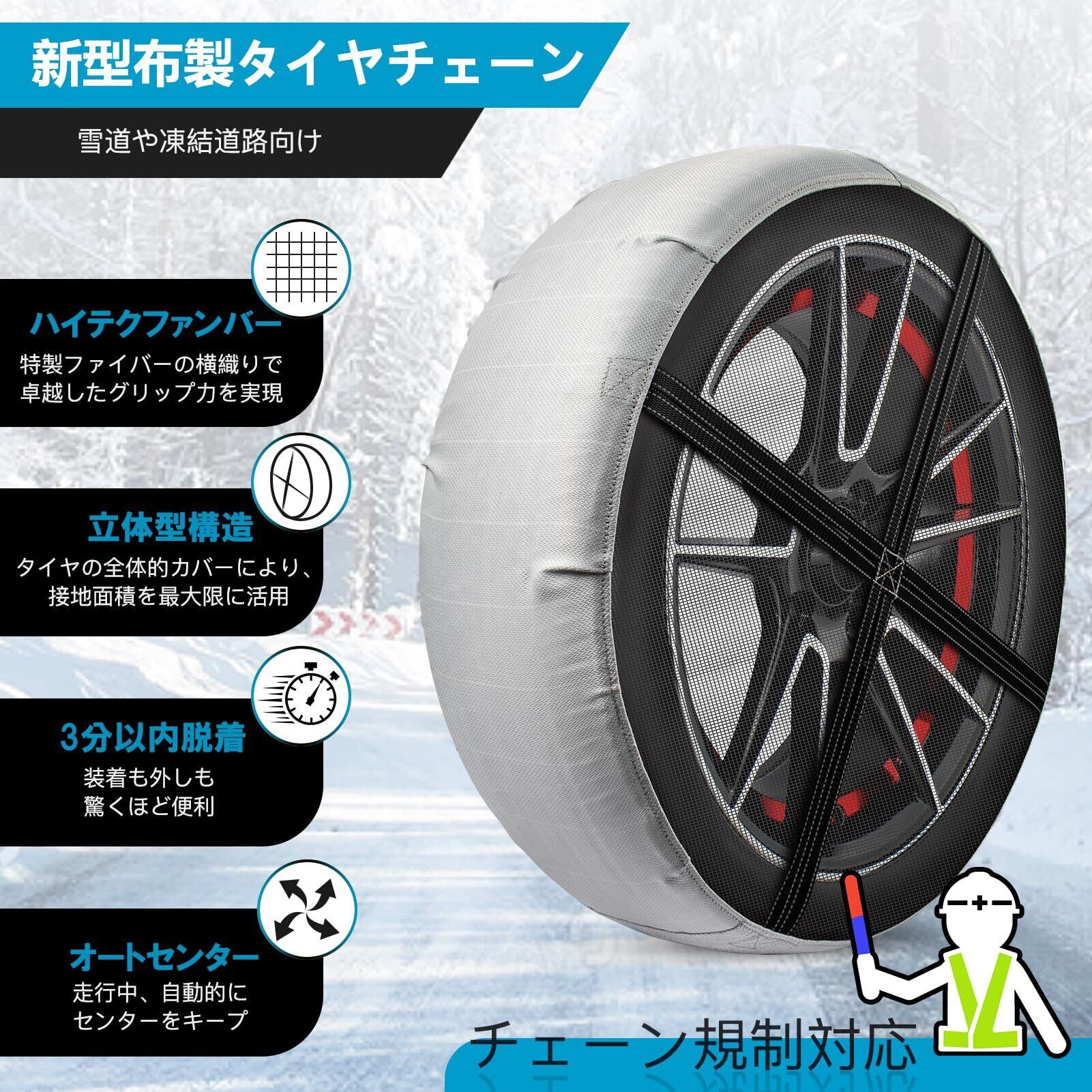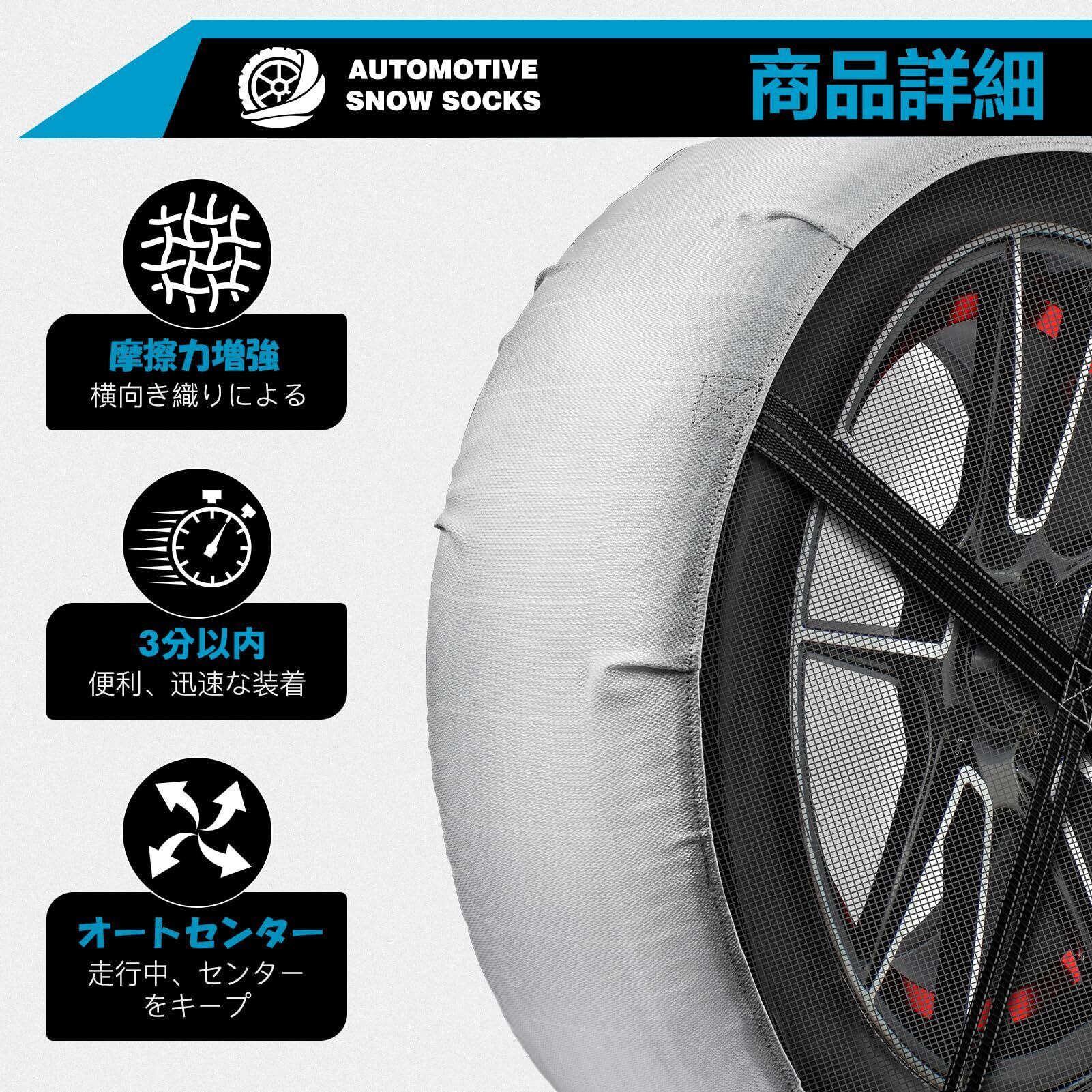 【雪道で差が出る高密度グリップ】 本品は高密度特殊繊維を採用したスノーソックス/布製タイヤチェーンです 雪や凍結路面で発生する水膜を吸収し、タイヤと路面の接地面積を拡大することで高い摩擦力を発揮します 非金属 タイヤチェーンのため走行音が静かで、快適かつ安定した走行をサポートします。ご注意:タイヤチェーンは雪道または凍結道路のみで使用し、40km/h以下で走行してください。