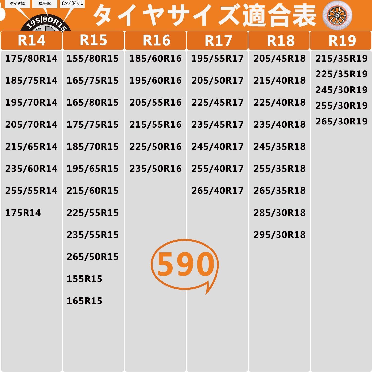 乗用車, S590適応タイヤ:175/80R14 185/75R14 195/70R14 205/70R14 215/65R14 235/60R14 255/55R14 175R14 155/80R15 165/75R15 165/80R15 175/75R15 185/70R15 195/65R15 215/60R15 225/55R15… 表示を増やす
