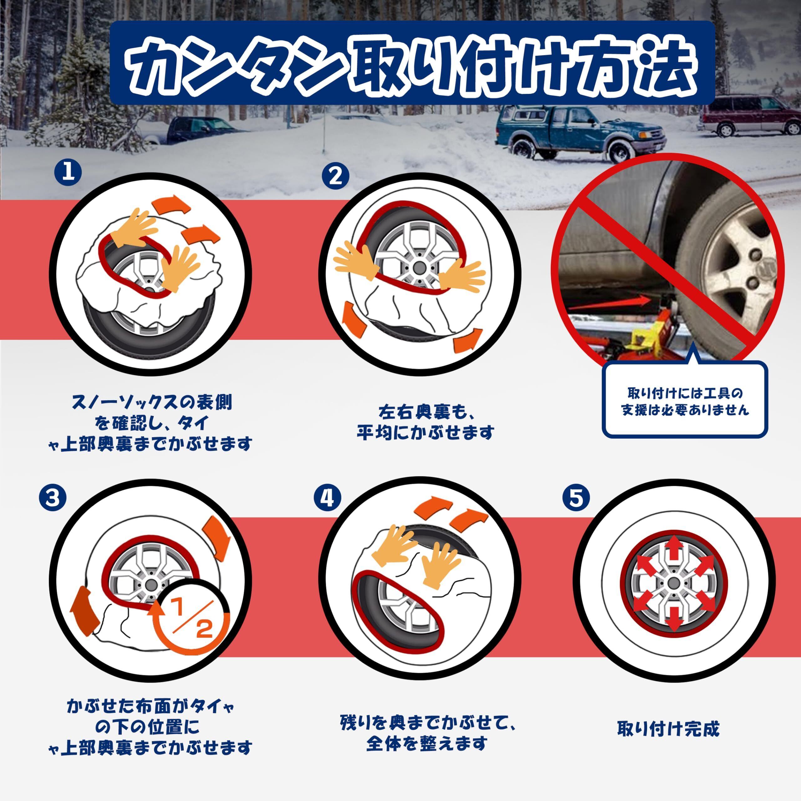 素早く簡単に装着:布製タイヤチェーン の装着は簡単で便利です。特別な工具を必要とせず、素早く安全にタイヤに取り付けることができる。また、軽量でコンパクトなので、トランクに簡単に収納できます