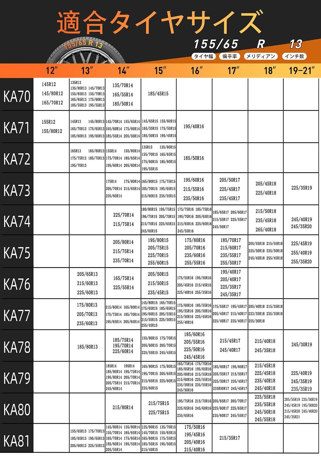 【KA79適応タイヤ】185R14 185/80R14 195R14 195/75R14 195/80R14 205/70R14 205/75R14 215/70R14 245/60R14 165/80R15 175/80R15 195/70R15 205/65R15 215/65R15 225/60R15 235/60R15 165/75R16 175/70R16 185/65R16 195/65R16 205/60R16 215/55R16 215/60R16 225/55R16 235/50R16 235/55R16 245/50R16 185/60R17 195/60R17 205/55R17 215/50R17 225/50R17 235/45R17 235R50R17 245/45R17 215/45R18 225/45R18 235/40R18 245/40R18 225/40R19 235/35R19 245/35R19