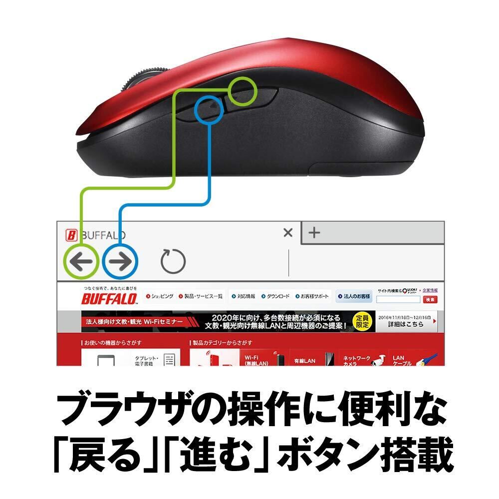 【2022最新】バッファロー マウス 無線 ワイヤレス 5ボタン 【戻る/進むボタン搭載】 小型 軽量 節電モデル 最大584日使用可能 BlueLED レッド BSMBW315RD