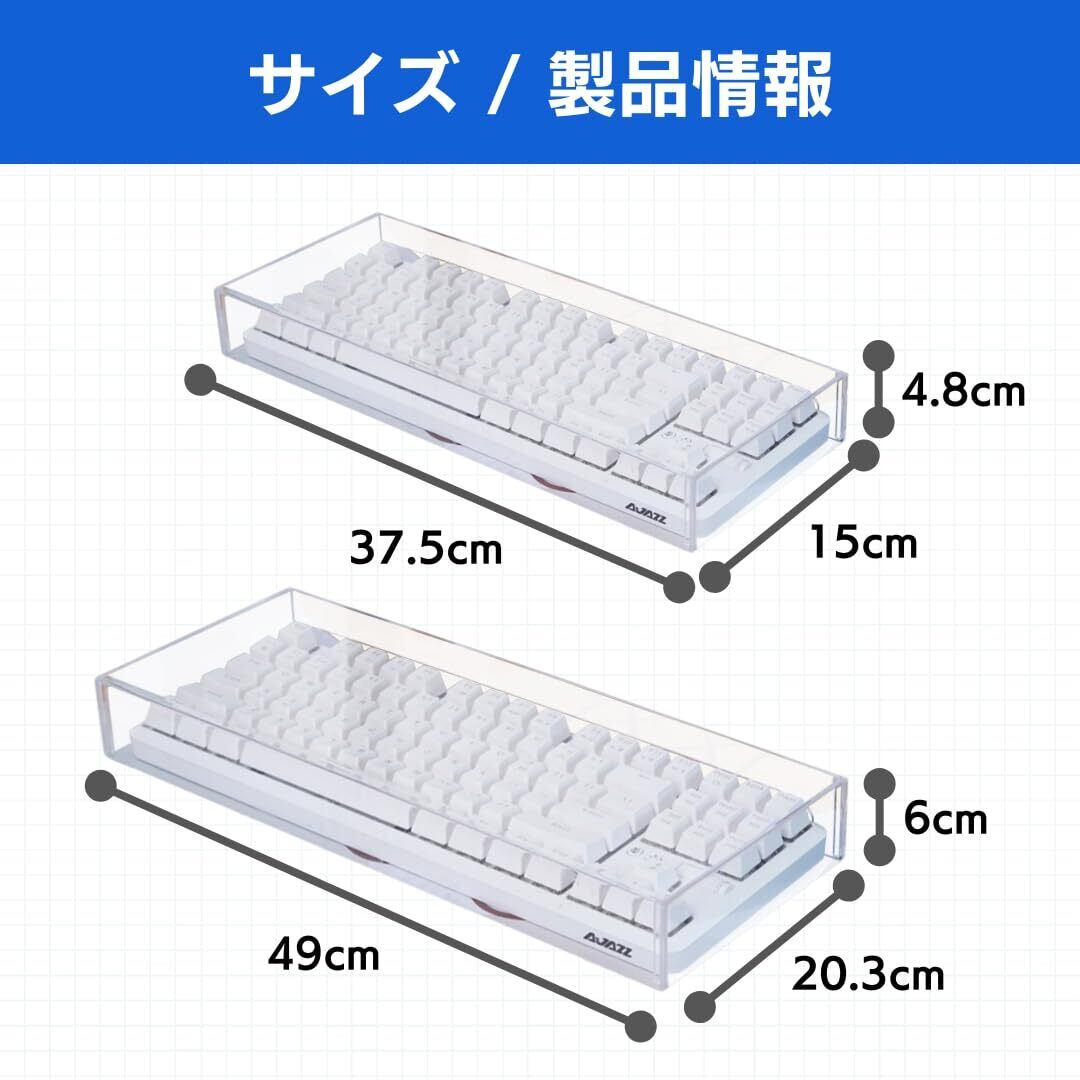 【作業環境を清潔に保つキーボードカバー】細かなゴミや髪の毛、ほこりなどがキーボードの間に入り込むのを防ぎ清潔な状態を保ちます。【デスクに自然に馴染む】透明性の高いアクリル素材は光をしっかり通し、美しい見た目でインテリアに自然に馴染みます。【ペットやお子様からもしっかり保護】耐久性があり、ペットやお子様が触れて万が一落としてしまっても壊れにくく、衝撃からキーボードをしっかり守ります。【ケーブルに配慮した設計】キーボードのケーブル接続に影響を与えず、スムーズに使用可能です。これにより、パソコン周りがすっきりと整理され、より快適な環境を提供します。【サイズ】・縦=4.8cm×横=37.5cm 奥行:15cm・縦=6cm×横=49cm 奥行:20.3cm