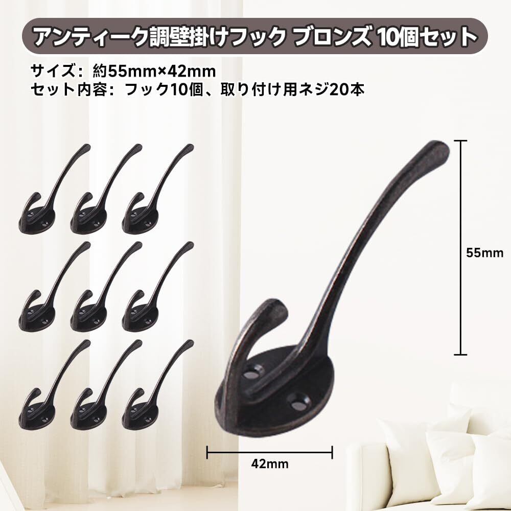 【アンティーク調壁掛けフック ブロンズ 10個セット】サイズ:約55mm×42mm セット内容:フック10個、取り付け用ネジ20本 【実用性とデザイン性を両立】コートや洋服、帽子、バッグなどの収納に便利な多用途フックです。玄関やクローゼット、浴室、キッチンなどさまざまな場所でお使いいただけます。 【クラシックな雰囲気を演出】アンティーク風のレトロなデザインが魅力。家具や扉、小物類との相性も良く、取り付けるだけでお部屋の雰囲気をぐっとおしゃれに演出できます。ちょっとした模様替えやインテリアのアクセントにもおすすめです。 【温もり感じるハンドメイド仕上げ】ひとつひとつ丁寧に手作業で作られており、サイズや形、色味に若干の個体差があります。量産品にはない、手作りならではの風合いと味わいが空間に自然な温もりを与えます。 【取り付け簡単で初心者にも安心】ネジ付きなので、届いてすぐに設置可能。ドライバーがあれば誰でも簡単に取り付けられます。木材や石膏ボードなどさまざまな素材に対応しており、DIY初心者の方でも安心してご使用いただけます。