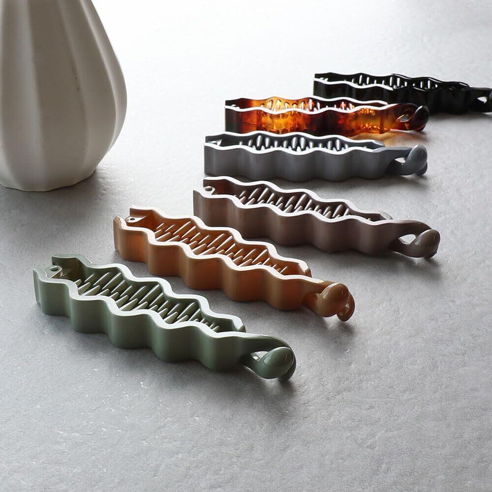 艶やかな質感でウェーブデザインが特徴的なバナナクリップです。 細身ですっきりとしたシルエットがスマートに決まり、デイリー使いからオフィススタイルまで大人の表情を魅せてくれます! カラーも大人レディにぴったりのカラー展開です