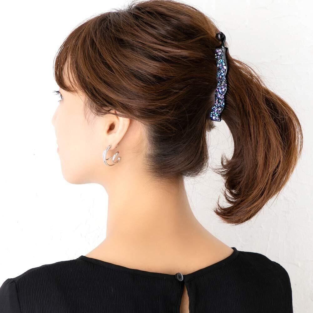 キラキラと煌めくグリッターが華やかなバナナクリップです。 波打つようなゆるやかなフォルムがなじみやすく、小さな丸と六角形のスパンコールをランダムに 敷き詰めた色彩がラフにまとめたヘアアレンジにアクセントを加えてくれます。