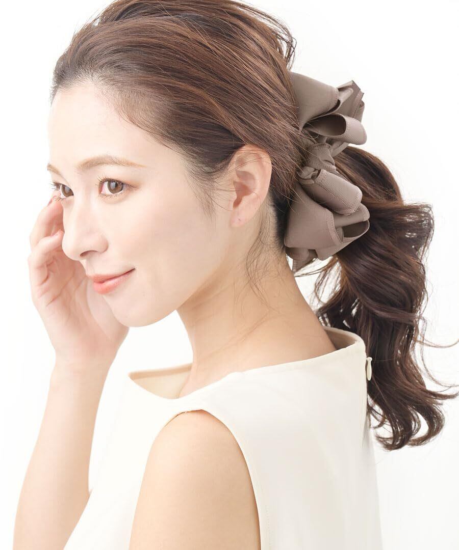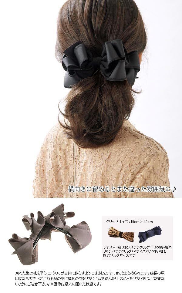 華やかで上品な印象を与えるベーシックなリボンのバナナクリップ。リボンは多重に重ねられ、立体感と大きなボリューム感を演出します。