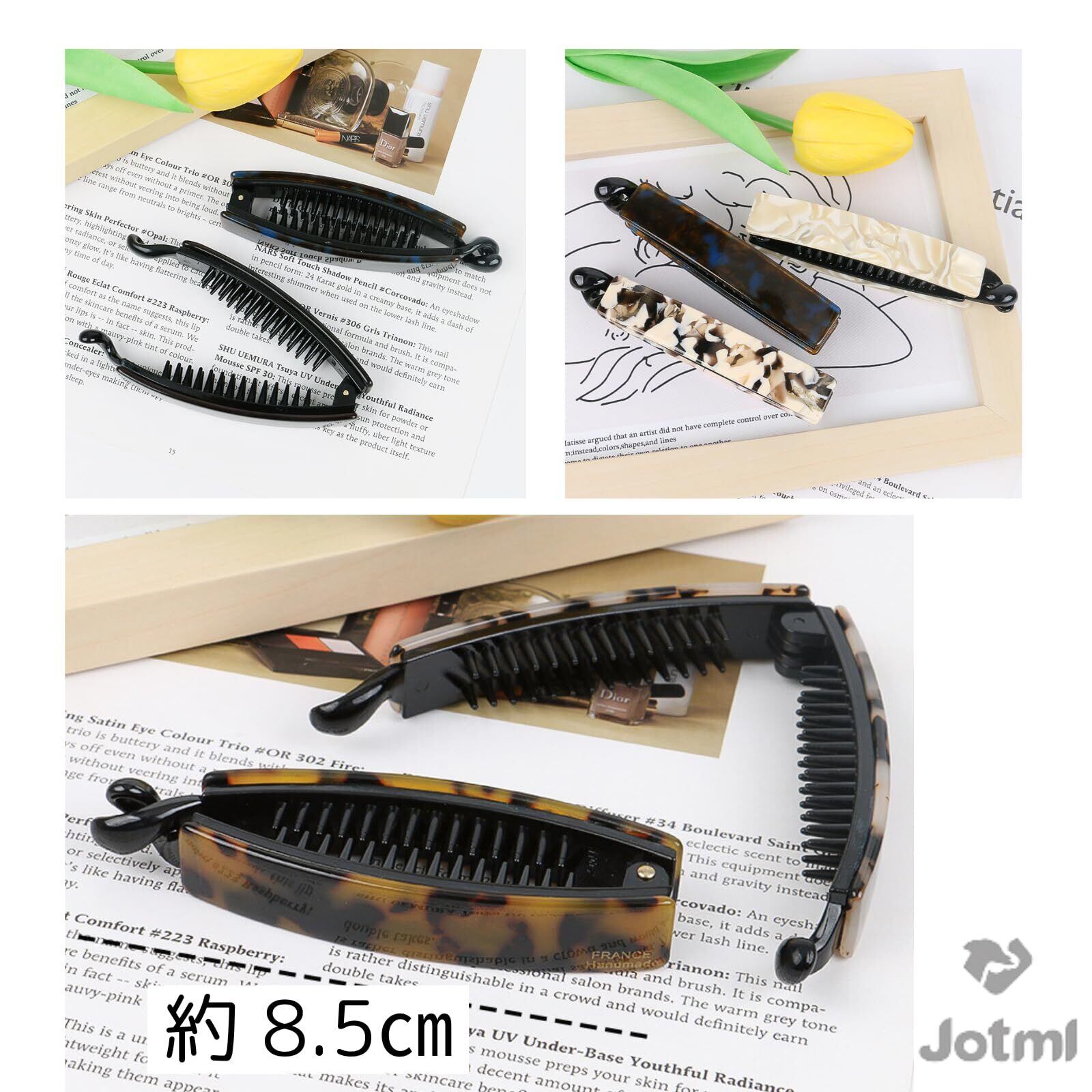 【バリエーション】2つセットでそれぞれに味のある個性的な色の組み合わせにしました。アセテートの美しい色合いを活かし、大人っぽく上品なべっ甲風デザインを含め、カラーも豊富なバリエーションをご用意しました。※一つひとつ柄の出方やカラーの濃淡に個体差がございます。個々の柄の出方を独特の風合いとしてお楽しみください。【サイズ】8.5cm(長さ)×2㎝(留めた時の厚み)