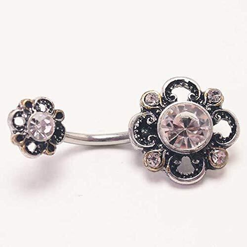 【人気のチャーム付きボディピ】ビンテージ風のお花が可愛いヘソピアス。真ん中にキラリと光るキュービックジルコニアがお洒落です。ボタン風のフラワーは固定タイプで使いやすく、デイリー使いにもおすすめ。人気のバナナバーベルです。