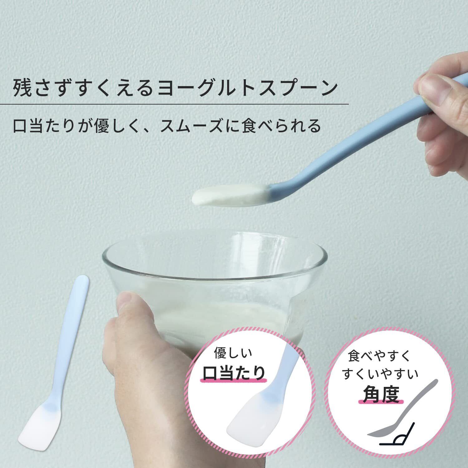 【残さず食べきれる】すくいやすい角度と、先端のやわらかいシリコーン素材でカップののスミと内側にぴったりフィット。ヨーグルトを残さず取りきれます。
