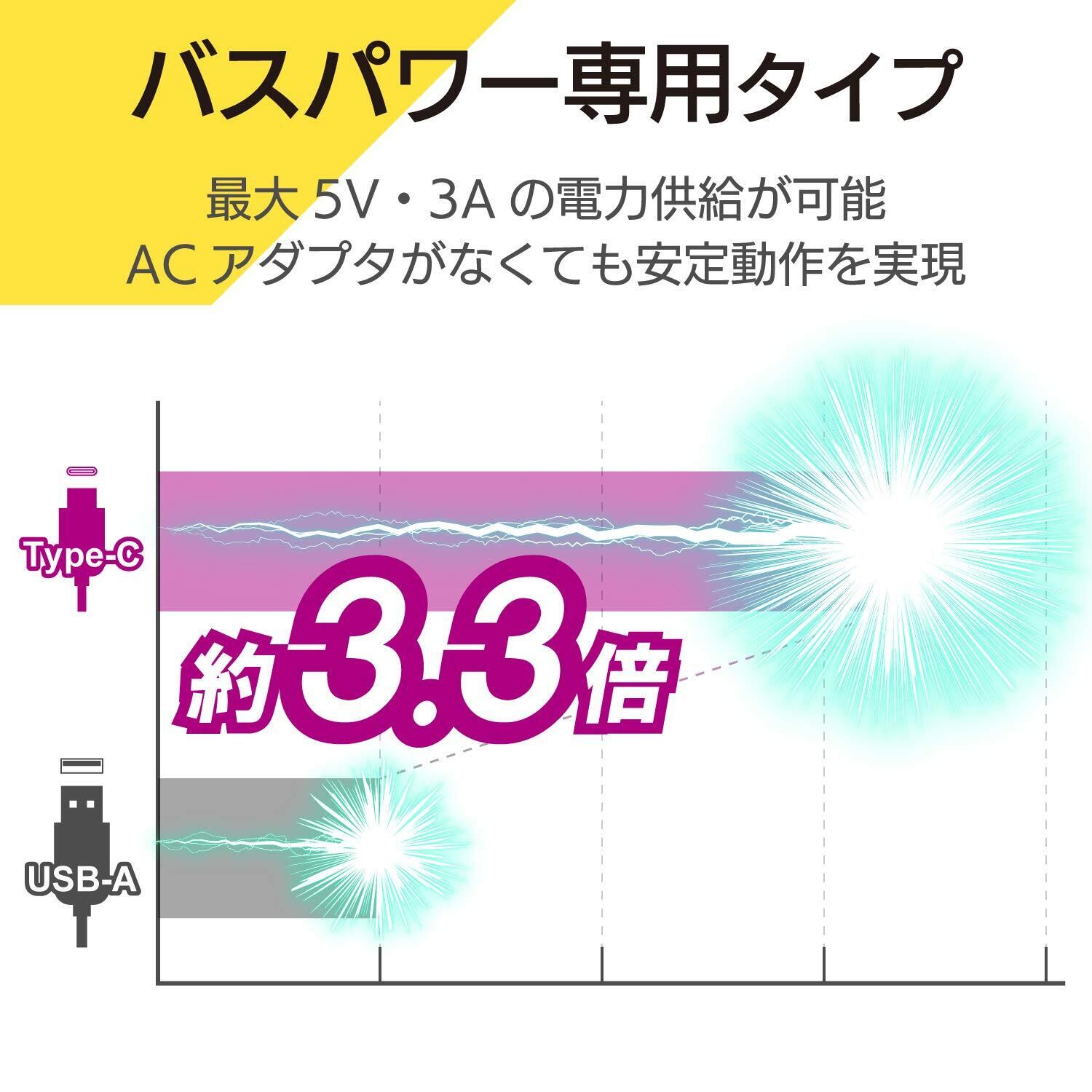 最大5V3Aの電力供給が可能で、ACアダプタがなくても接続機器の安定動作を実現します。