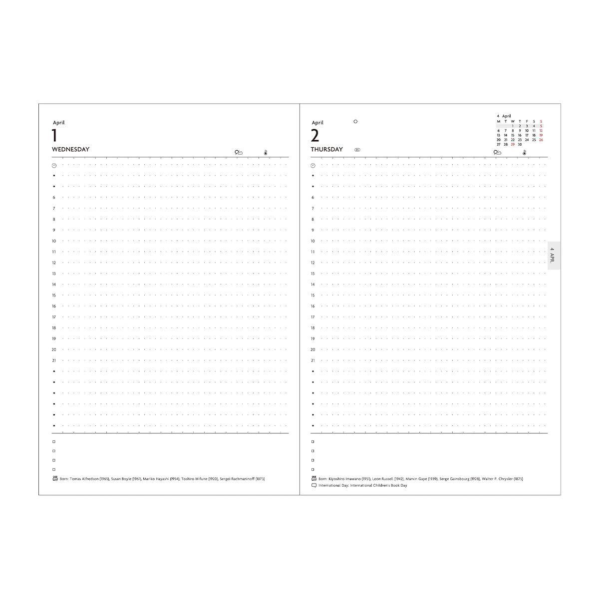 EDiTの定番B6サイズの1日1ページ手帳のリフィル。朝活や深夜の予定管理もできる24時間軸。文字はもちろん、表やイラストも書きやすいドット罫線(5mm)です。年間・月間プランページ付き。予定・タスク管理、日記帳、ライフログ、アイデア用ノート、……あなた次第で使い方が広がる1日1ページ手帳です。日付入りのノート感覚で、あるいはカバーをしてお使いください。