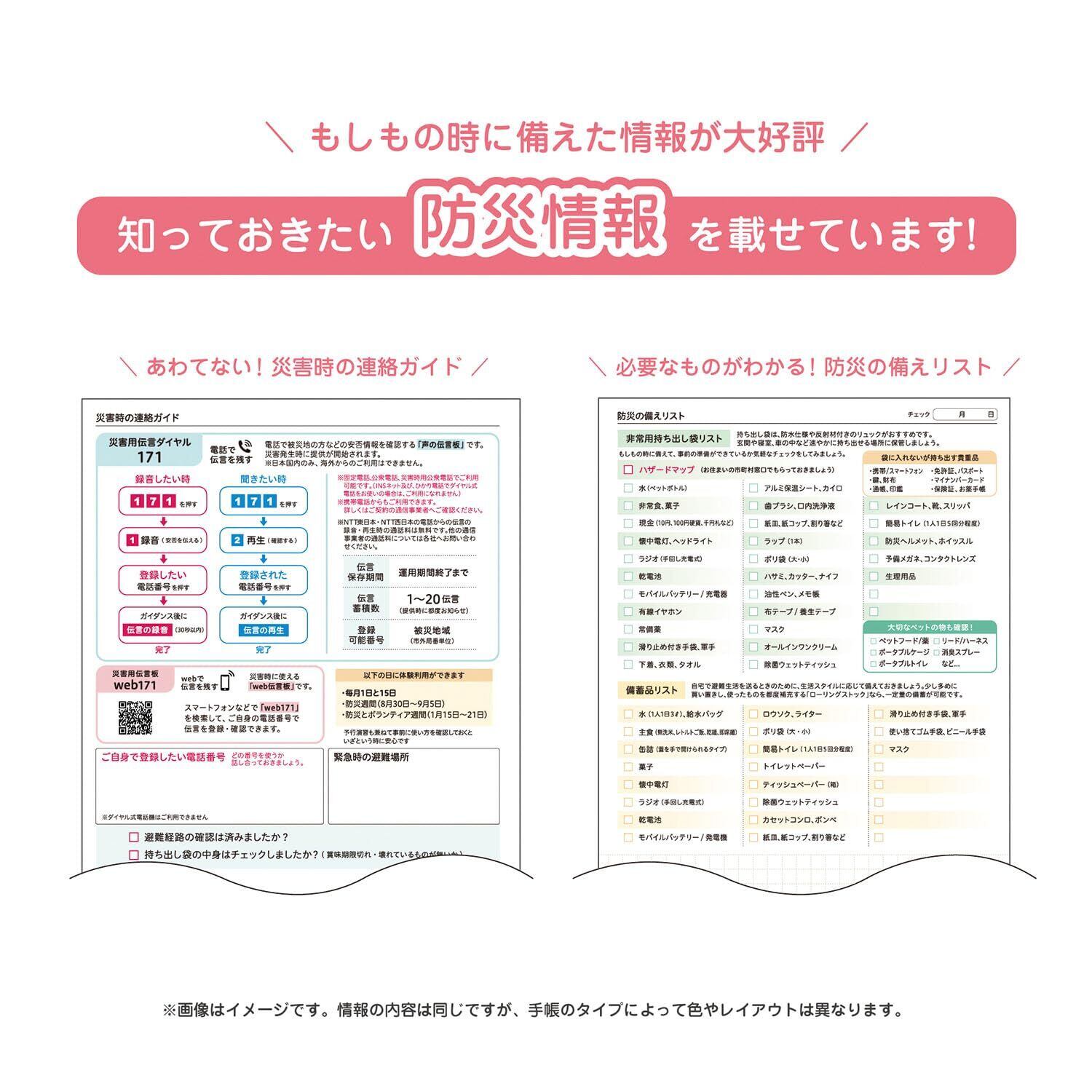 【コンテンツ】年間カレンダー、年間計画表、アドレスメモ、テレフォンガイド/パスワード番号リスト/お金の管理メモ、災害時の連絡ガイド/緊急時の連絡先メモ、防災の備えリスト、年齢早見表/チェックリスト