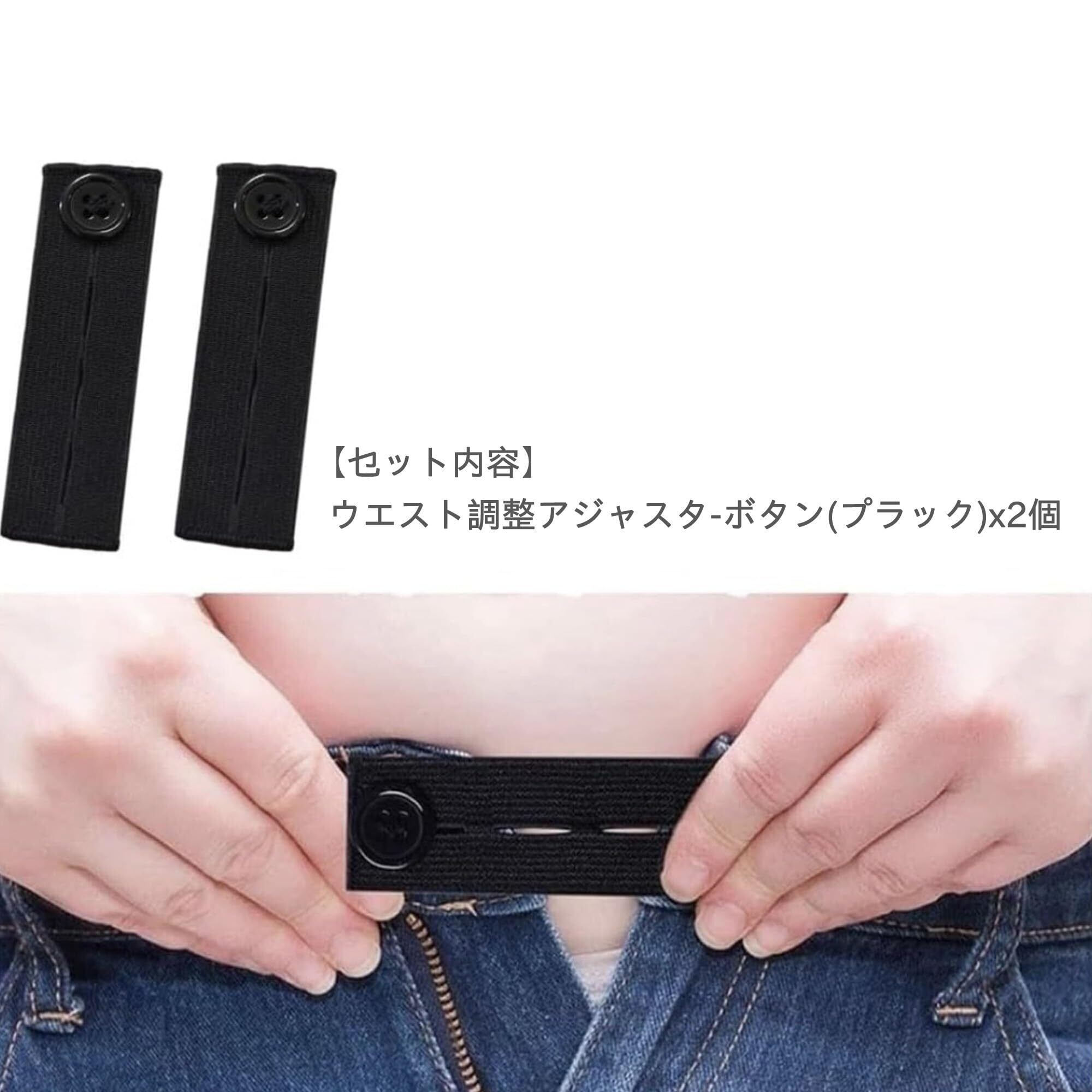 【商品内容】 ブラックのウエスト延長バンド×2個セット。サイズ:約8.5cm×2.5cm、ボタン直径:約1.5cm。縫製・工具不要、誰でも簡単にウエストを拡張できる便利アイテムです。お気に入りのパンツをもっと快適にフィットさせることができます。