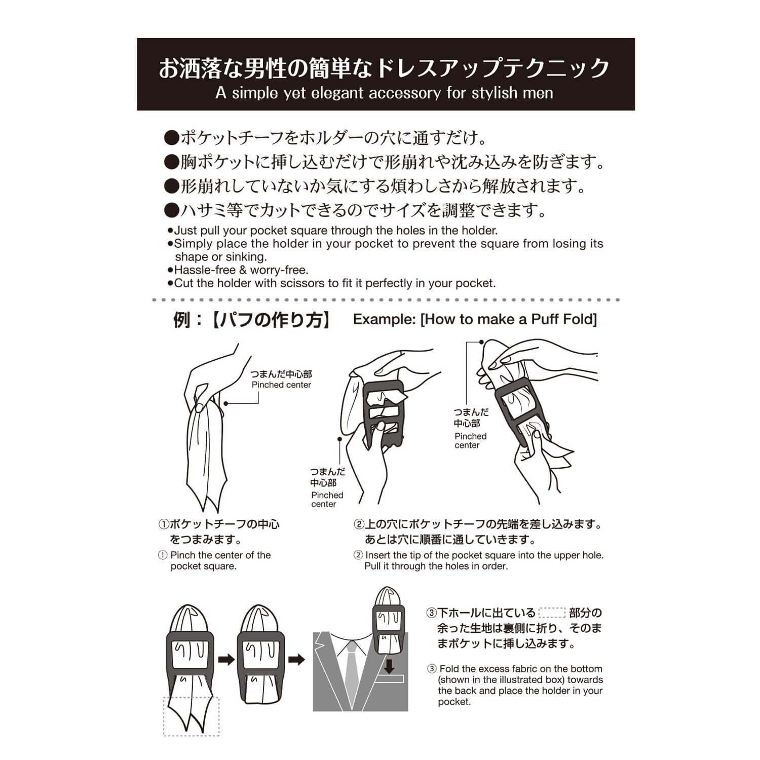 【特長】◎お洒落な男性の簡単なドレスアップテクニック。◎ポケットチーフをホルダーの穴に通すだけ。◎胸ポケットに挿し込むだけで形崩れや沈み込みを防ぎます。◎形崩れしていないか気にする煩わしさから解放されます。◎ハサミ等でカットできるのでサイズを調整できます。