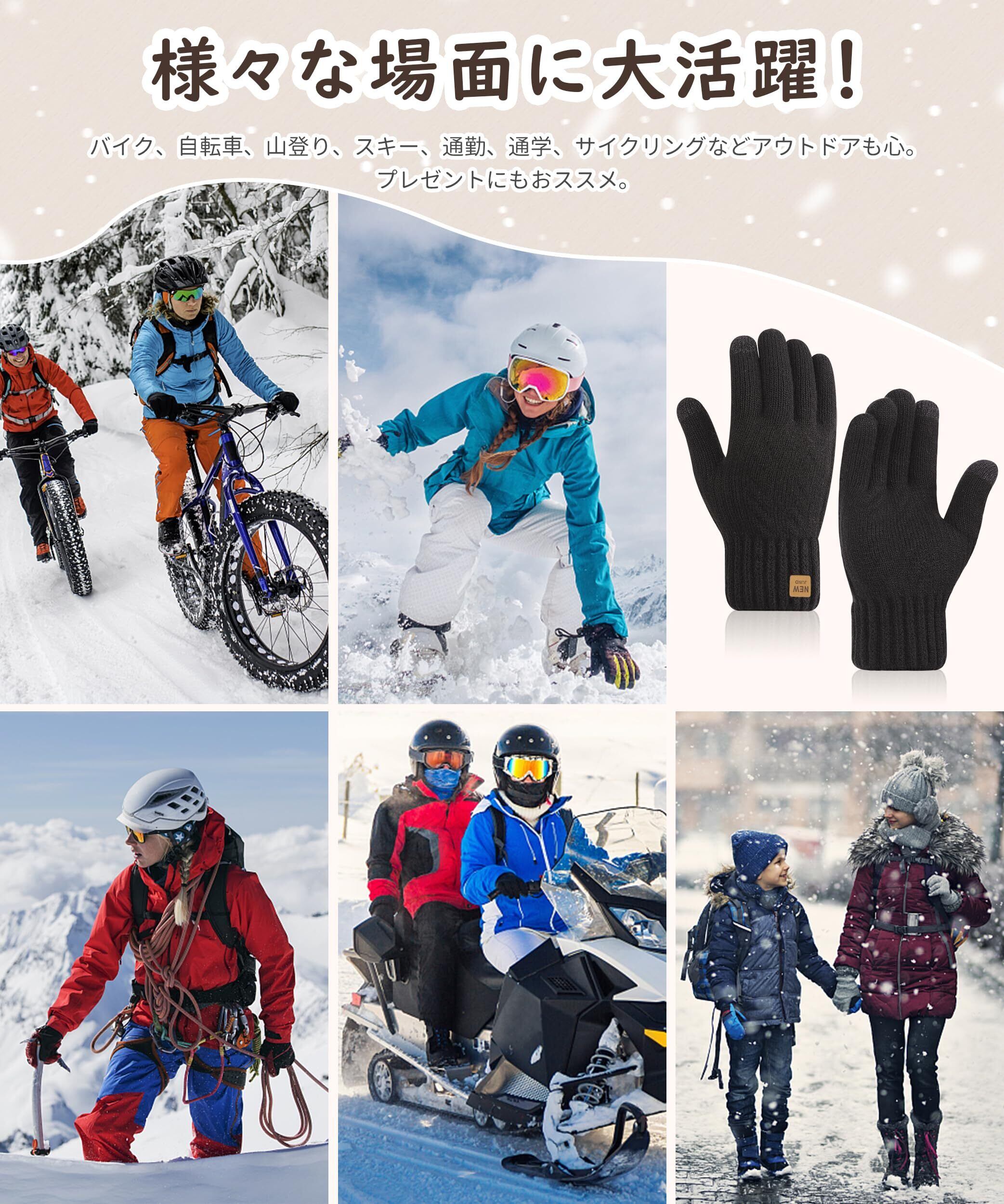 【暖かい厚裏起毛・手首の部分もしっかり守る】手袋の表面は保温性に優れたニットを採用、内側に柔らかく厚みのあるの裏起毛素材付き、熱を閉じ込めやすく、つけるだけで体温の上昇が感じられ、手全体から指先までしっかり温めてくれて、肌に優しく快適な着心地を実現している防寒手袋です。さらに、手袋は二重編みの弾性束口を採用し、袖口との隙間を作らない、手首からの冷気の侵入を防ぎ、寒い冬でもポカポカで、着け心地のよくて保温性・防寒性・通気性を兼ね備えたスポーツグローブやサイクリンググローブとしても素晴らしいです。