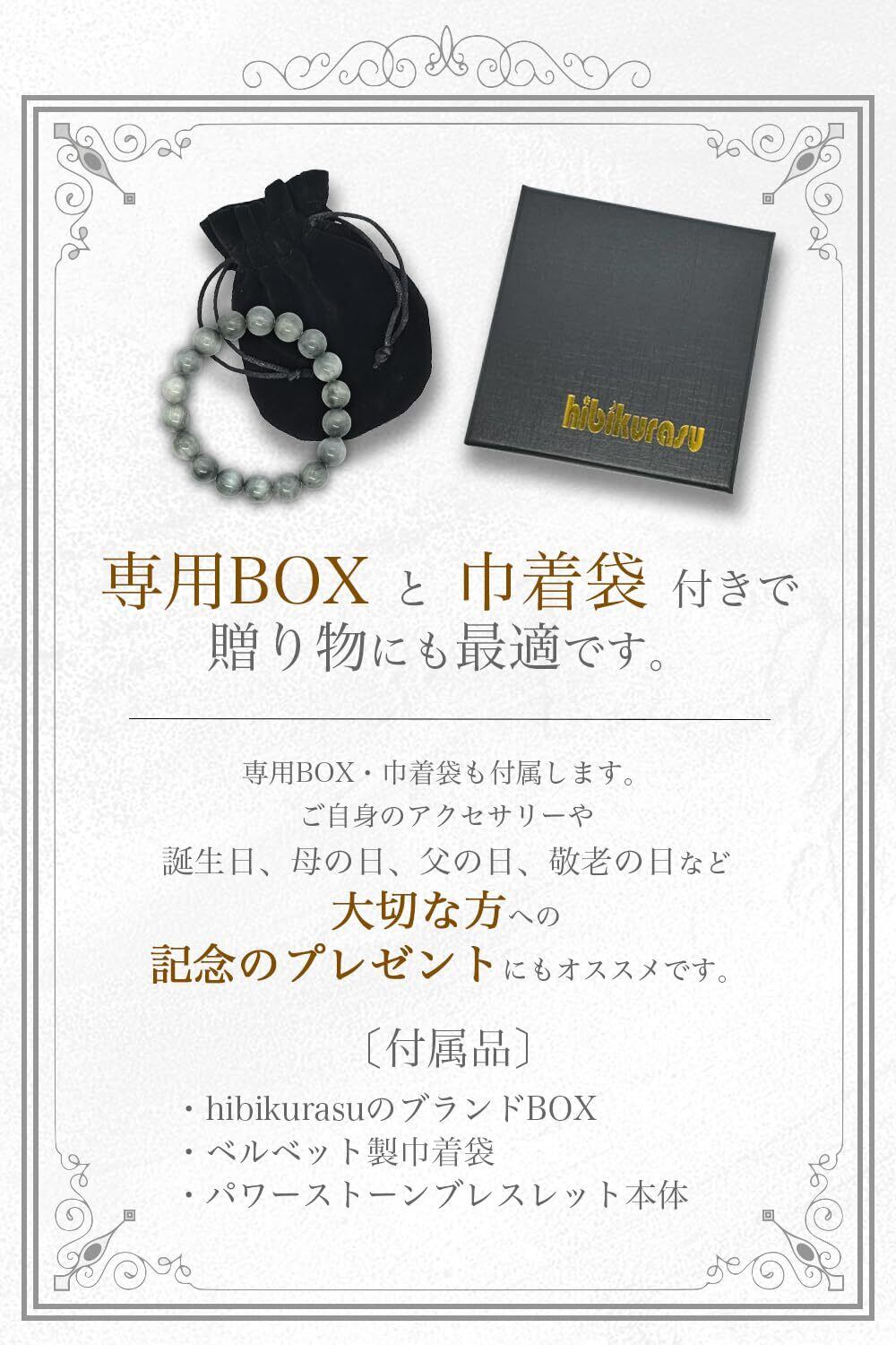 外箱・巾着袋も付属しますので、ご自身のアクセサリーや大切な方へのプレゼントにもオススメです。hibikurasuでは日本基準の高い検品・梱包・販売・発送にて皆様のお手元にお届けいたします。お気に召さない点がございましたら、返品ポリシーに基づき速やかに対応させていただきます。