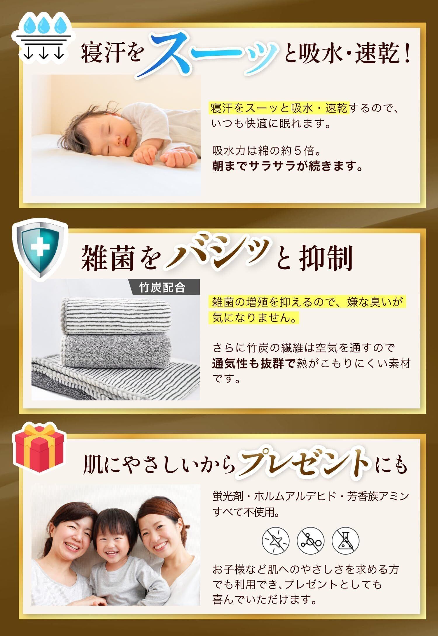 【寝汗をスーッと 吸水 / 速乾 】吸水率は綿の約5倍! 通気性も抜群なので暑い日でも快適に眠れます。